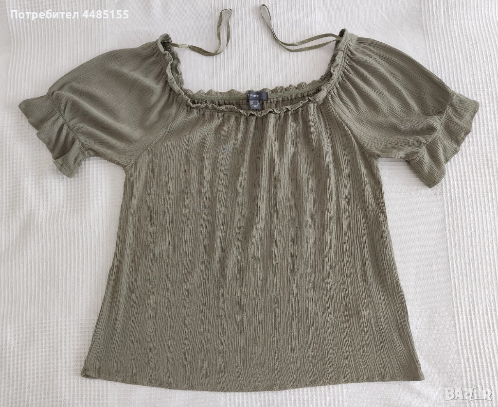 Маслиненозелена блуза PRIMARK, EUR 42/UK 14. M/L. Свободна и удобна, но не по-малко женствена и секси. Деколте широко, ластично, за паднало рамо по желание. Ръкав богат с лек ластик. В отлично състояние.