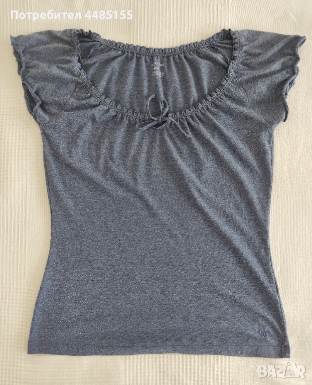 Синя блузка essentials by KVL с паднало ръкавче и широко ластично деколте с връзка, S, по-скоро М. 65% памук. В добро състояние. Подарък е към другите блузи, ако се изберат всички заедно.
