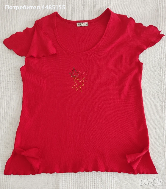 Червена блуза RASTI, L/M. 90% памук. Разтегливо, но стегнато памучно трико. Две цепки отстрани, дълги 9 см. Обло деколте и интересно голо ръкавче - усеща се като блуза без ръкав и привнася допълнителен чар. В отлично състояние. Блузката е италианска.