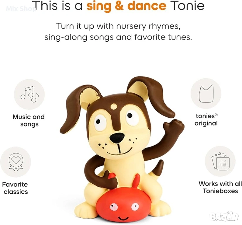 КАК РАБОТИ: Възпроизвеждането започва автоматично, когато аудиогероите на Тонита се поставят върху Toniebox. Натискането на ушите променя силата на звука. Докосването отстрани променя песните. Контролерът Tonieplay [продава се отделно] взаимодейства с 2-та светлинна пързалка на Toniebox, за да отключи интерактивни преживявания.