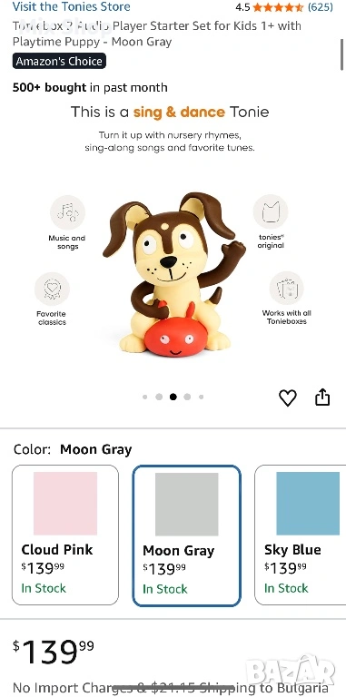Стартовият комплект включва Moon Gray Toniebox 2, 8,6” [22 см] USB-C кабел за зареждане и Playtime Puppy Tonie. Захранващ адаптер, по-дълъг кабел за зареждане и допълнителни Тонита, продавани отделно.