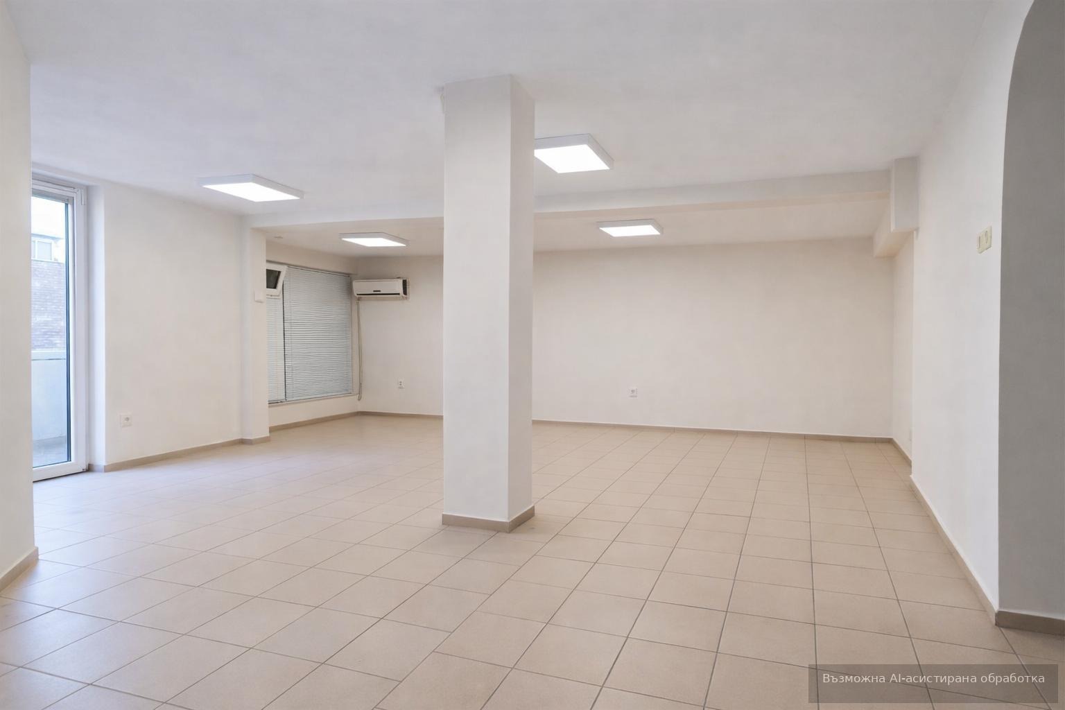 Разполага с площ от 80 кв.м и е ситуиран на партерен етаж, като разпределението включва еднопространствено помещение тип open space , санитарен възел, складово помещение