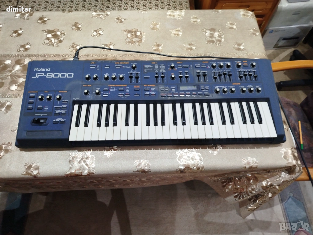 Електронен клавишен инструмент, произведен от Roland. Това е модел JP-8000 с диапазон от пет октави. Корпусът на клавиатурата е тъмносин и има сив текст в горния ляв ъгъл, който гласи „Roland / JP-8000“. Над клавиатурата има серия от циферблати и контроли.