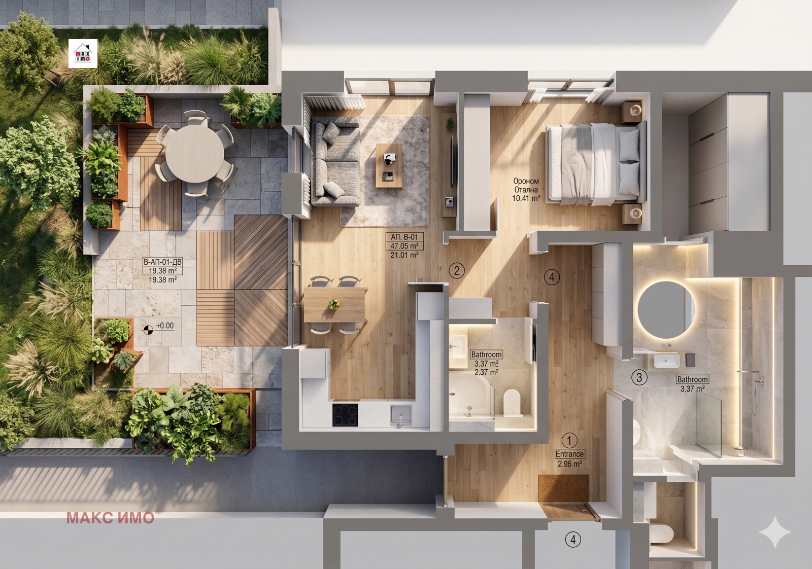 Имаме удоволствието да ви представим, двустаен апартамент в новостраяща се сграда в Младост 2. Сградата се намира на много комуникативно място, в близост до множество магазини, хипермаркети, детски градини, училища и спирки на градски транспорт. В непосредствена близост е и парк Въртопо. Въпреки високата плътност на застрояване в района, проектът залага на обмислено и богато озеленяване, което да придаде усещане за простор и уют. Toвa peшeниe нe caмo пoдoбpявa ĸaчecтвoтo нa живoт в cгpaдaтa, нo и oблaгopoдявa зaoбиĸaлящaтa cpeдa, ĸaтo дoбaвя зeлeнинa тaм, ĸъдeтo тя e цeнeн и pядъĸ pecypc. Разнообразните жилища, отоплението с парно, контролираният достъп, зарядните станции за електромобили, допълват спектъра предимства на този специален проект - който може да бъде и ваш дом. Апартаментът, който се продава е със застроена площ от 47.05 m², и прилежащи към него 12.43 m² общи части. Също така разполага и с 19.38 m² двор. Състои се от всекидневна с кухненски бокс, спалня и баня с тоалетна. Цената е с включено ДДС. Очакван срок за завършване на сградата до края на 2027 година. В зависимост от схемата на плащане, която си изберете, може да бъде договорена и допълнителна отстъпка до 50 /m² - без ДДС. Разполагаме с още имоти в градата, както и в цяла София. За допълнителна информация 0897614791 Димитър Граховски