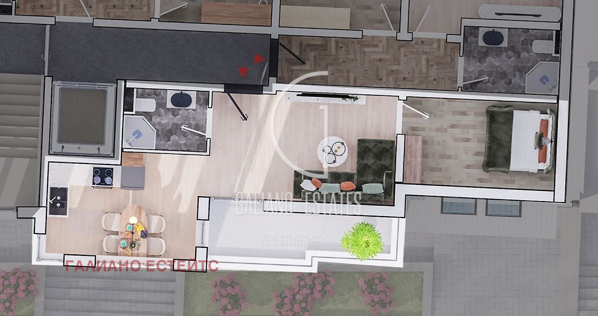 Без комисионна от страна на купувача!!! Galiano Estates има удоволствието да ви представи двустаен апартамент в новострояща се сграда. Разполагаме с ограничени бройки двустайни и тристайни апартаменти, както и подземни паркоместа и гаражи! Апартаментите са просторни и светли.Състои се от преддверие, просторна дневна с кухня и трапезария, една спалня, една баня със санитарен възел и една тераса със излаз от дневната, квадратурата на терасата е 8 кв.м. застроена площ 10 кв.м. с идеалните части. Строителството на жилищата включва следните видове СМР: