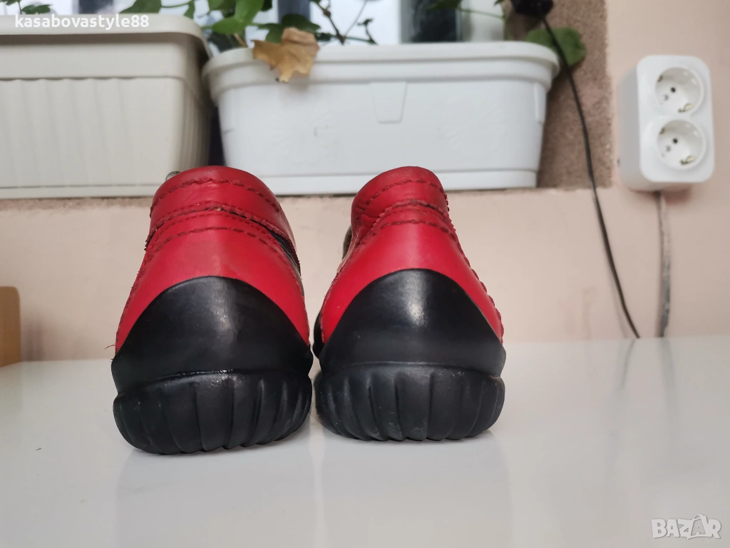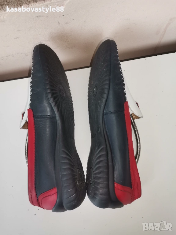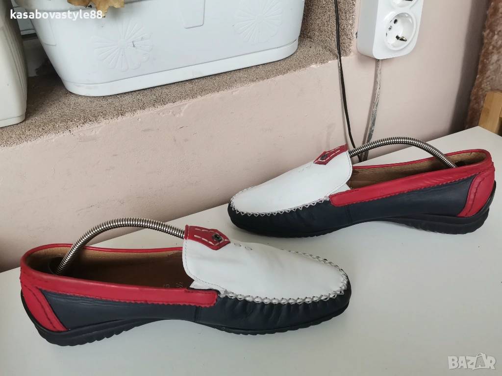 Дамски обувки тип мокасини изработени от естествена кожа, известни със своя комфорт и класически спортен дизайн. Обувани само веднъж, неразличими от нови!! Те са в тъмно-син цвят,в комбинация с бяло и червено. Ходилото е ултра гъвкаво и олекотено.Разполагат с много мека стелка от естествена кожа с дължина 25см и странични ластици за по-лесно и обуване. Ходило 2.5см.Цялостна височина отзад. 8см.