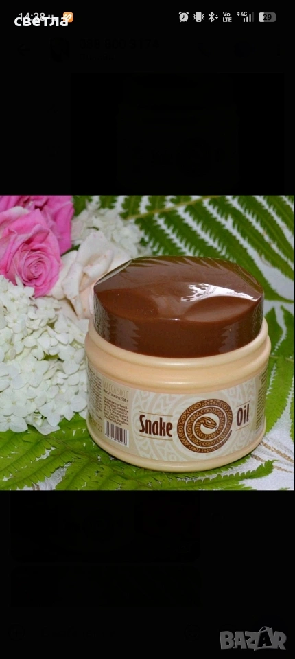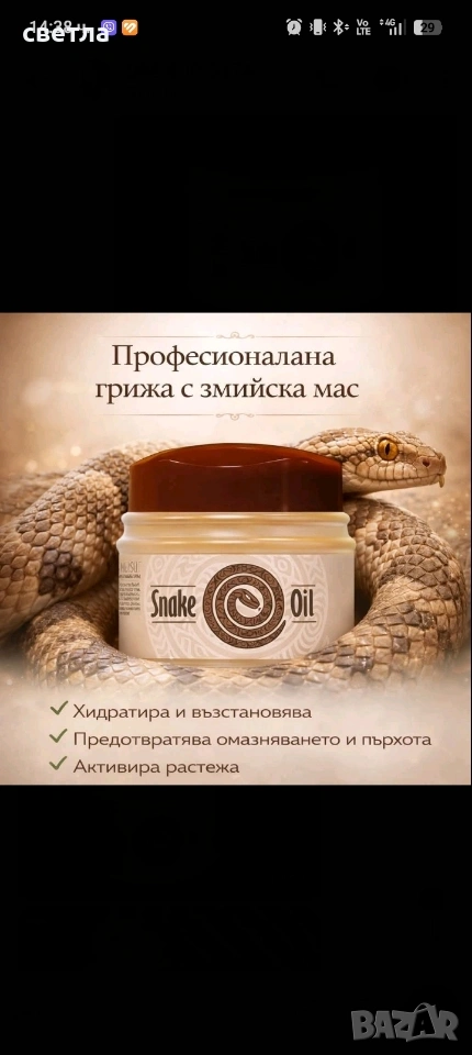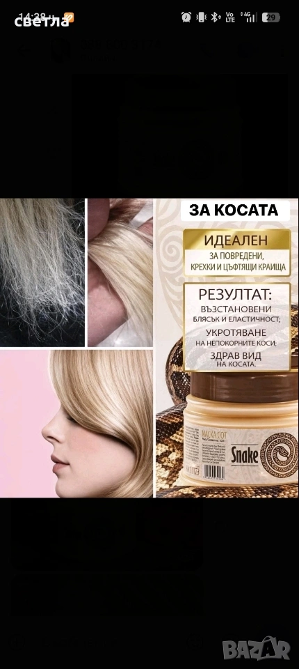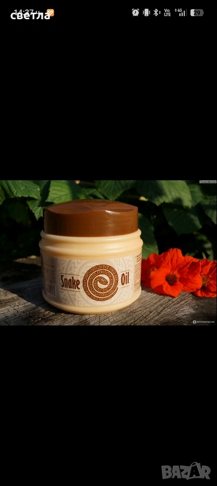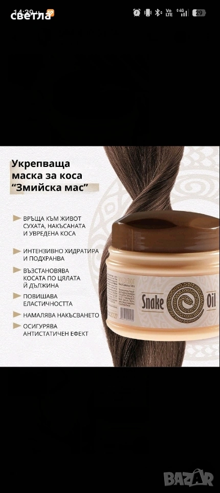 Укрепваща маска „Змийска мас” помага за активирането на космените фоликули, стимулира техния растеж и възстановява структурата на косата.