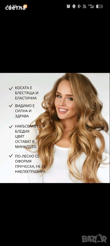 Ефект на ламиниране на косата – възстановява целостта на косъма. В резултат на това влагата, витамините, аминокиселините остават вътре в косъма, за да го подхранват и укрепват по цялата му дължина. Косата отново става бляскава, еластична, обемна и запазва формата си добре. Подобен ефект се получава чрез ламиниране на косата – покриване на косата с вещество със специален състав, което залепва разединените люспи на косъма.