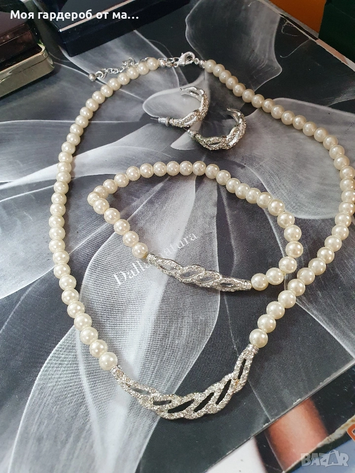 Нежен комплект от искуствени перли и сребьрни кристали. Отличен за сватба.парти.абитуриент. Колие.гривна и обеци. Лондон