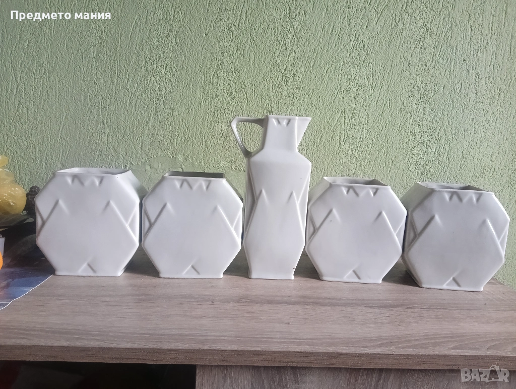Предлагам автентичен комплект от 5 части за съхранение на продукти и подправки. Изработени от качествен бял порцелан със специфичен геометричен релеф и нежна флорална декорация. Комплектът е произведен в България и е чудесен пример за индустриалния дизайн от миналия век.