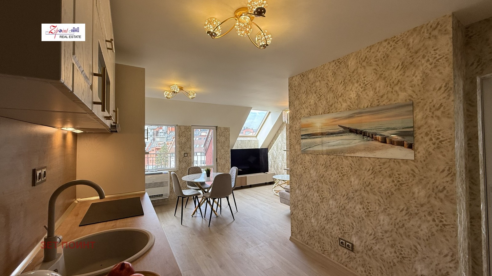 Разпределение: хол с кухненски бокс напълно оборудван с висок клас уреди, отделна спалня, баня с вана, мокро помещение- пералня със сушилня.