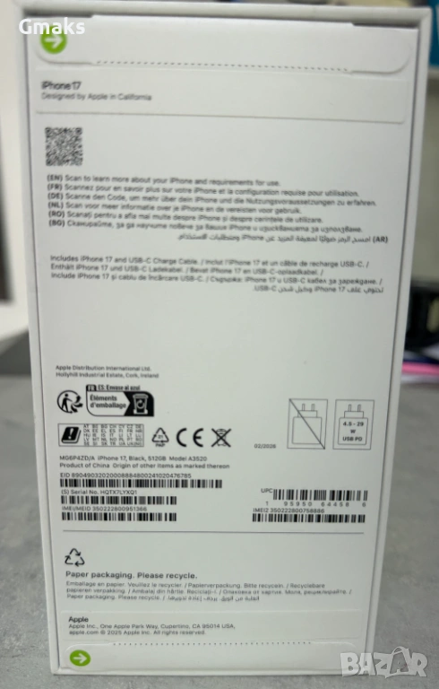 Смартфон Apple - iPhone 17, 6.3’’, 8GB/512GB, чисто нов .