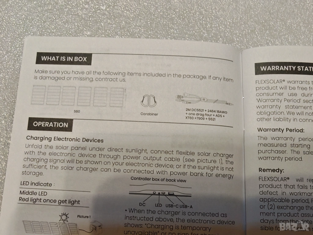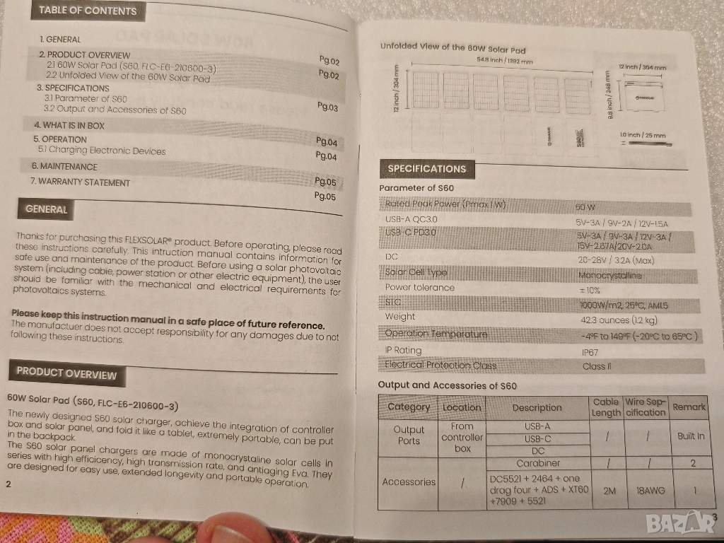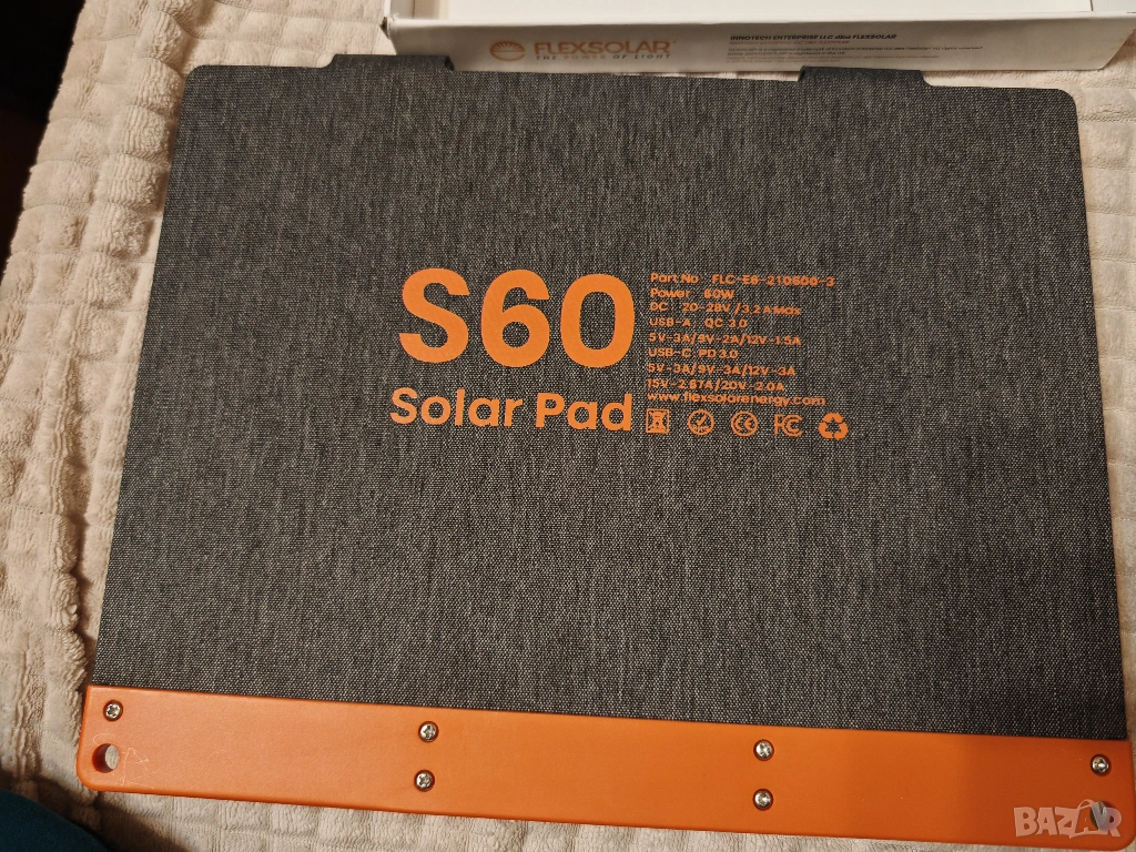 Продавам преносим соларен панел FlexSolar S60 с мощност 60W. Панелът е като нов, използван минимално, в отлично състояние и напълно изправен. Продава се с оригиналната опаковка.