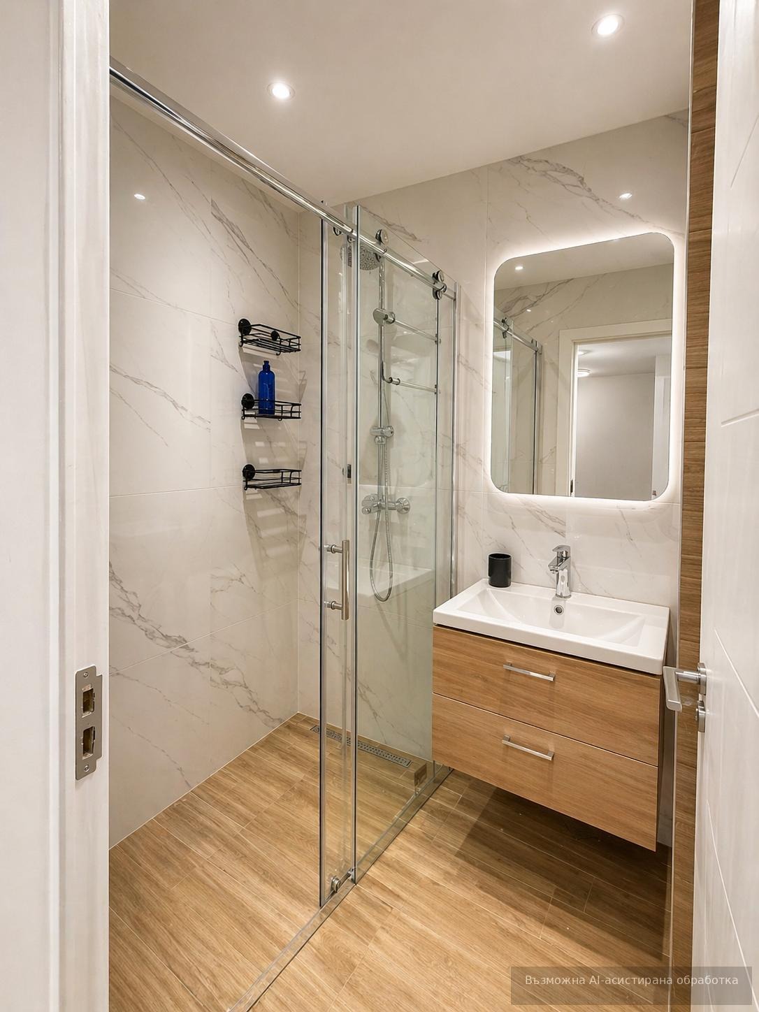 Ситуиран на 1-ви жилищен етаж, имотът разполага с площ от 60кв.м., разгърната в следното разпределение: входно антре, всекидневна с кухненски бокс, спалня, баня с душ кабина, самостоятелна тоалетна и тераса.