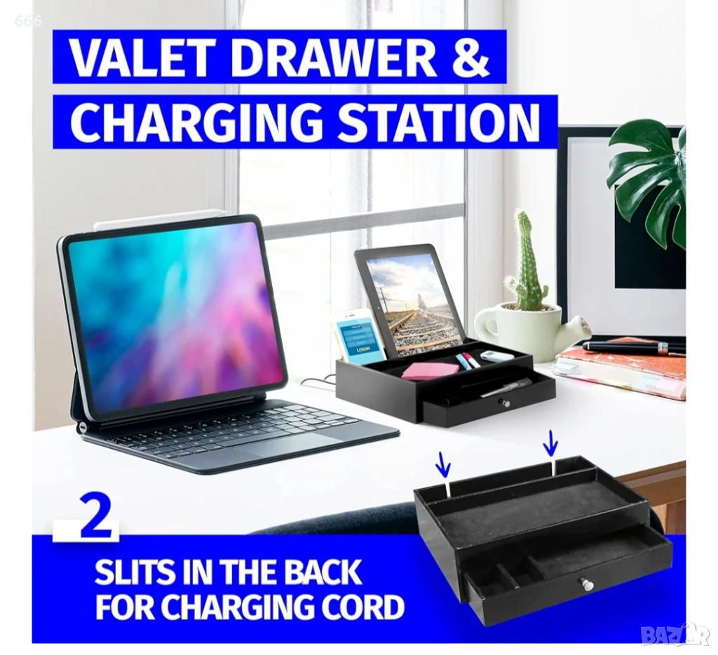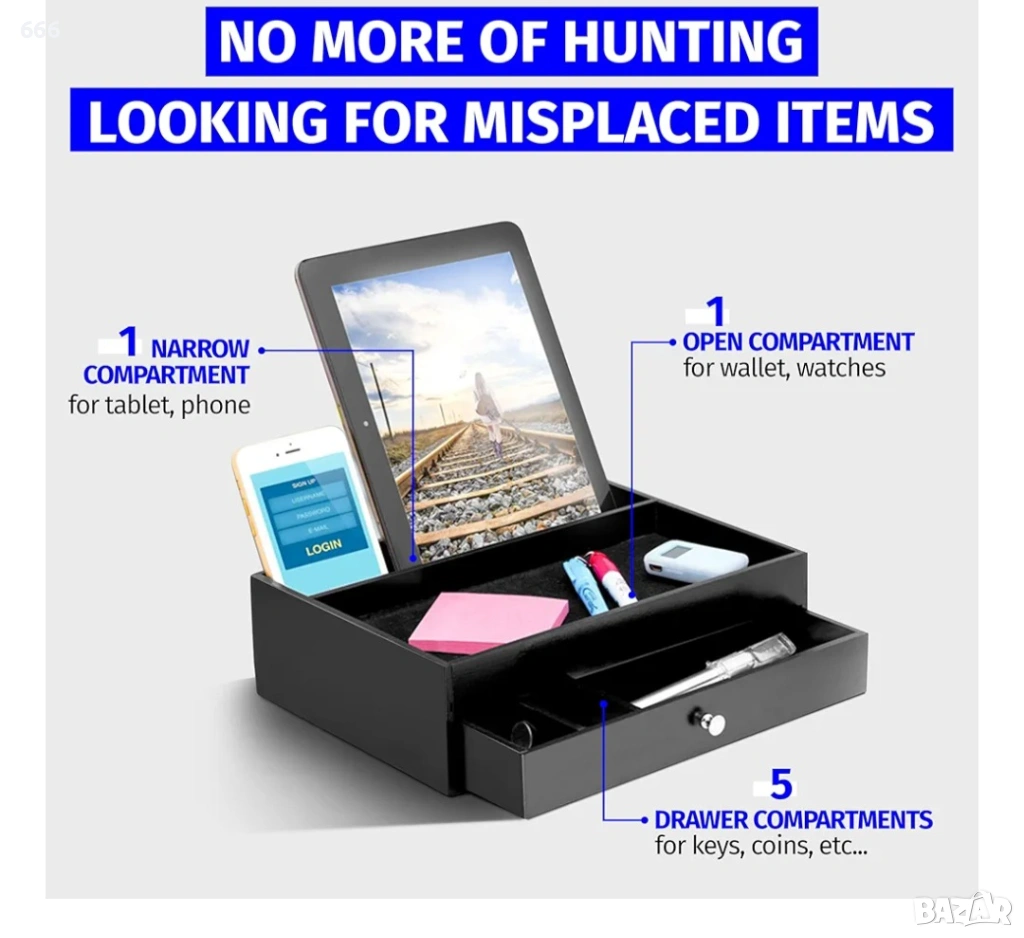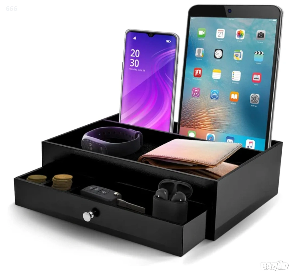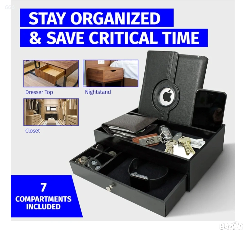 БЪДЕТЕ ОРГАНИЗИРАНИ И СПЕСТЕТЕ ВАЖНО ВРЕМЕ. Не търсете повече всеки път, когато имате нужда от важен предмет. Нашият органайзер за нощно шкафче за мъже е прост, но ефективен аксесоар за дома или офиса, който ще държи всички ваши най-важни вещи на едно място. Тази поставка за мъжки органайзер за нощно шкафче е проектирана да побира предмети като ключове за кола и къща, очила, мобилни телефони, джаджи, портфейли, ръчни часовници, кредитни карти и други вещи. Подобрете търпението си у дома или в офиса, като използвате тази докинг станция и органайзер за мъжки скрин.