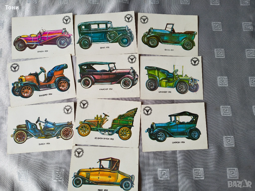 - Характеристики: Всяка картичка представя конкретен модел от началото на XX век (Бугати, Фиат, Форд, Ситроен, Рено и др.).