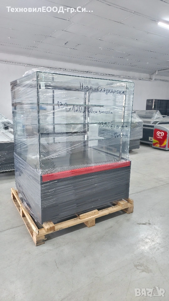 Продавам Нова Сладкарска хладилна витрина.Размери 130х120х160 см височина.