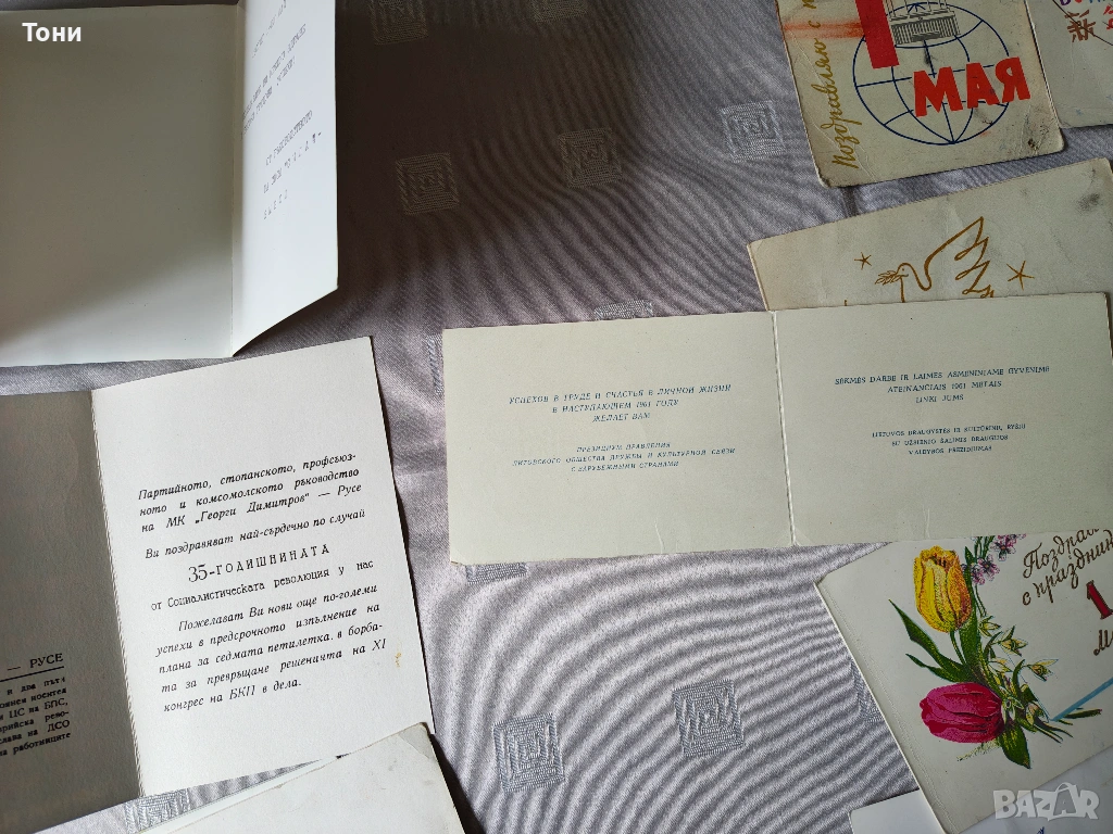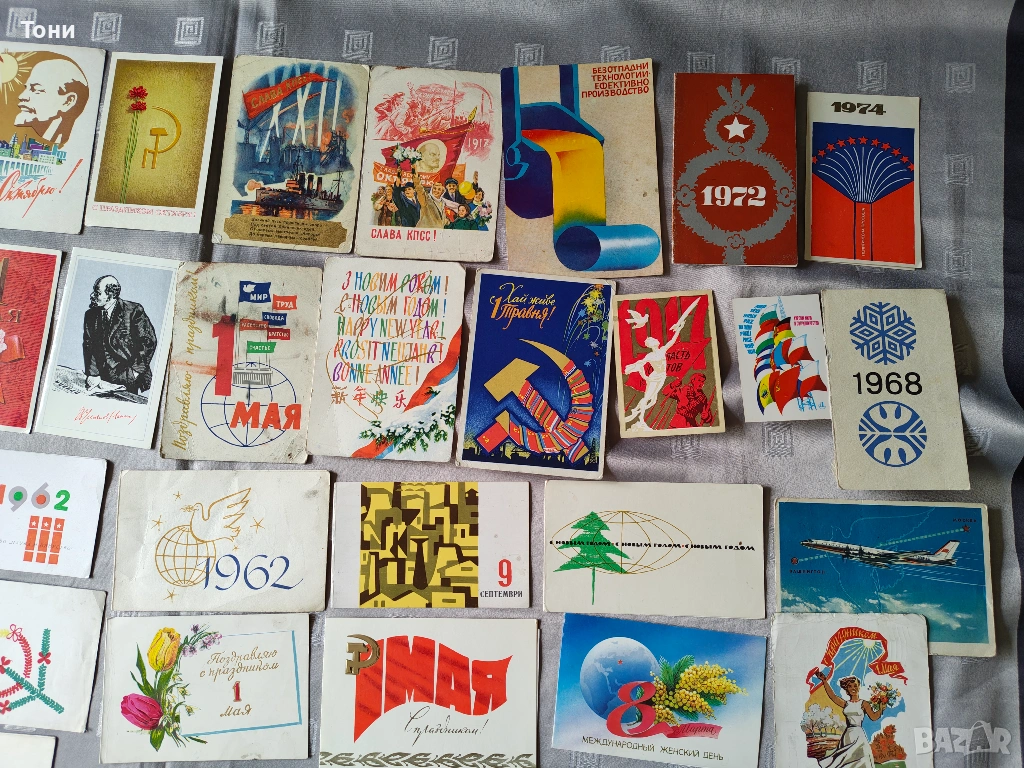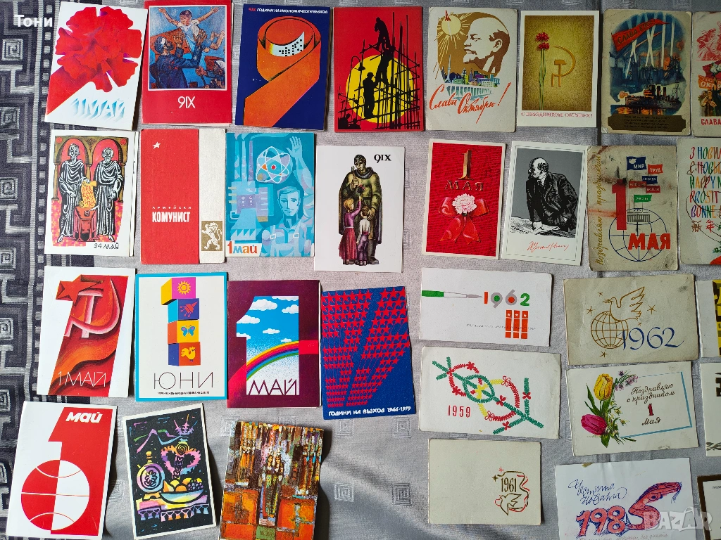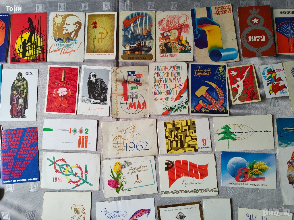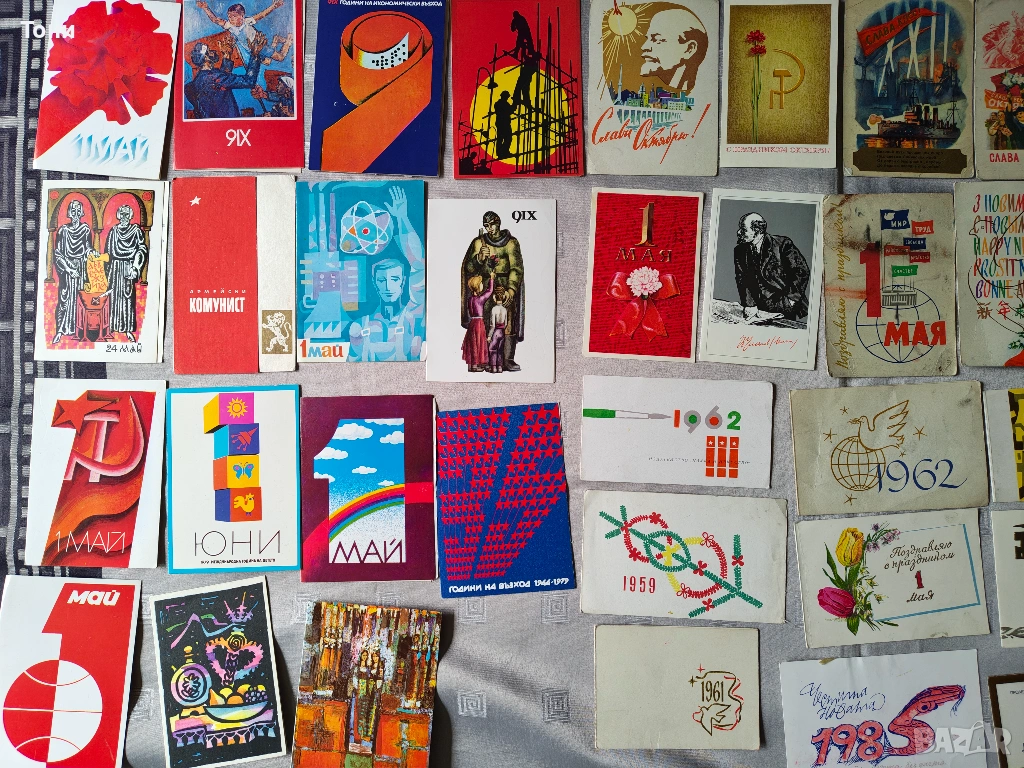 - 1 май (Ден на труда): Множество картички със знамена, гълъби на мира и сърп и чук.