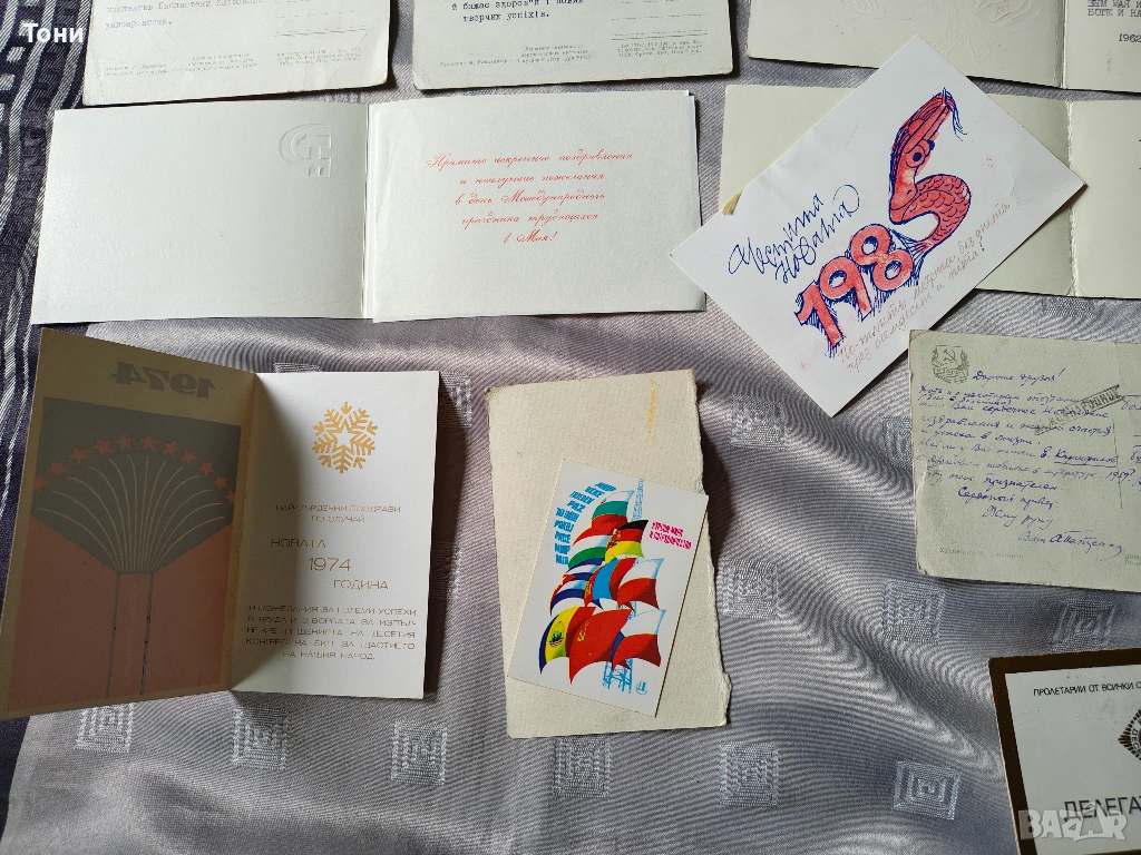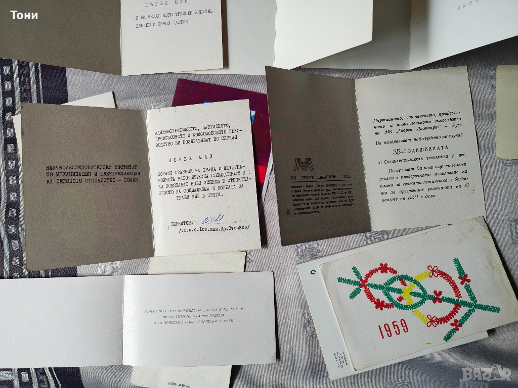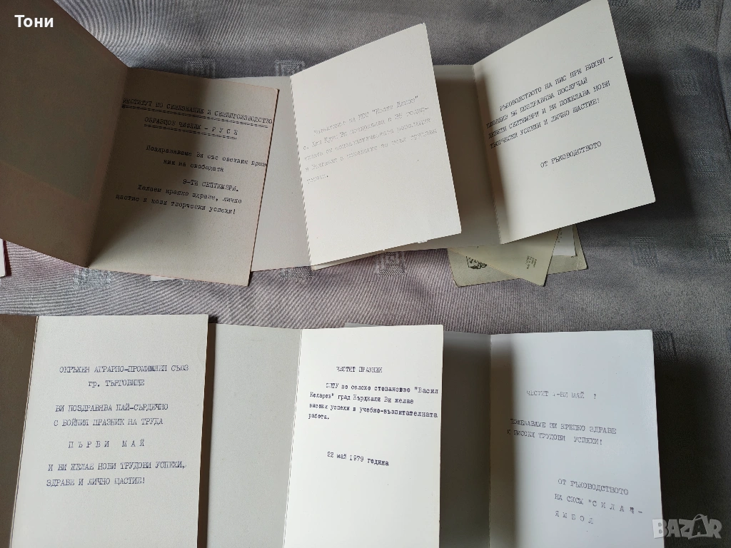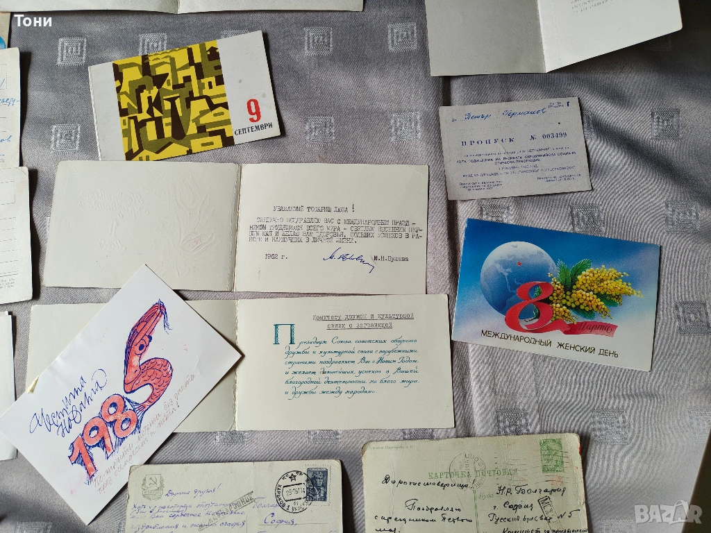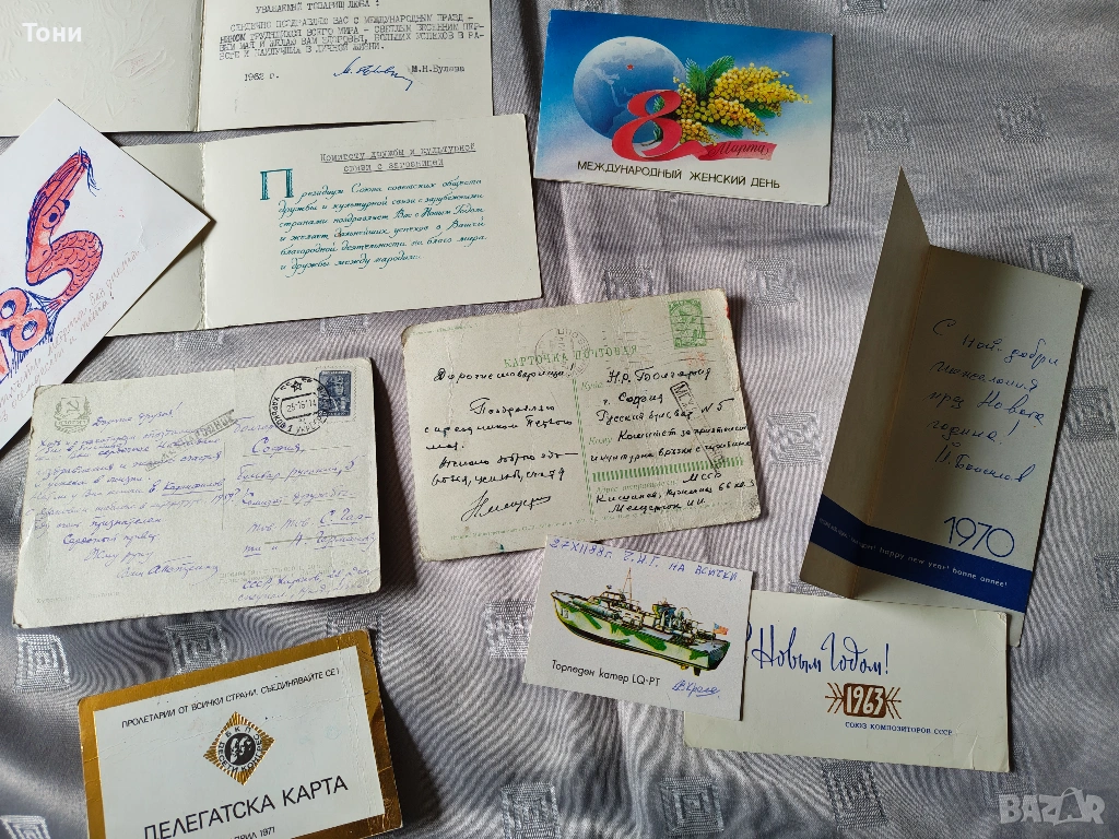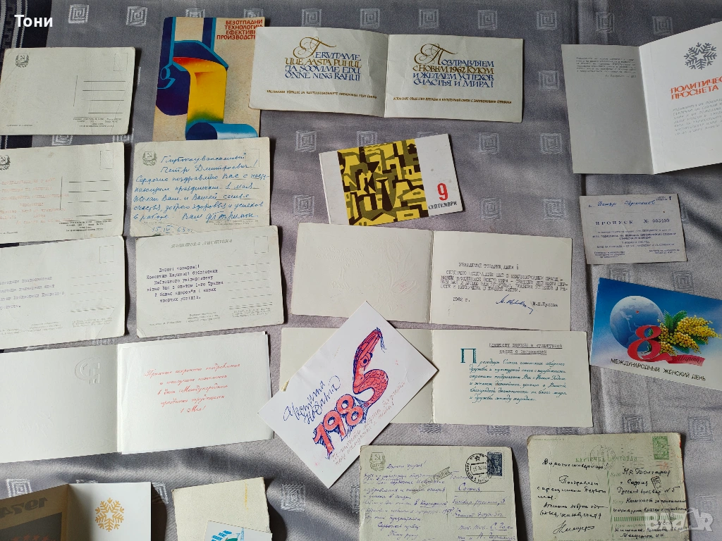 - Вижда се писмо/картичка, изписана на ръка със син химикал, започваща с "Другарко...". Това са реални пожелания между колеги или познати, които показват тогавашния етикет.