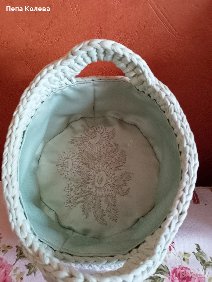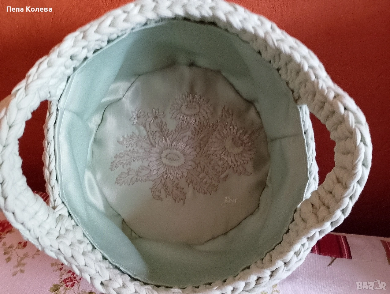 Голям панер от прежда Макарон -ръчно плетиво с размери диаметър на дъното 26см височина 16 и диаметър в горната част 26 см.Подплата с машинна бродерия цветя.