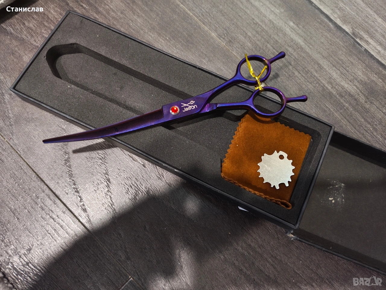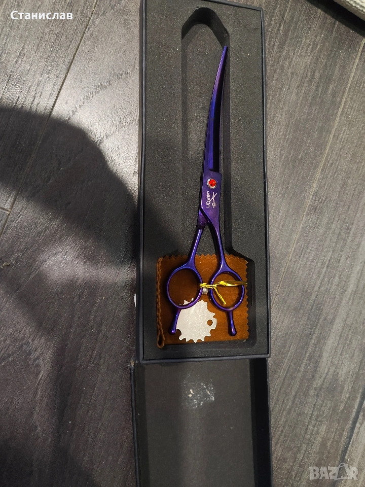 Тази лилава извита ножица в комплекта е предназначена за прецизно груминг подстригване, като е особено подходяща за оформяне на заоблени зони като главата, муцуната и лапите на домашни любимци. Продуктът е брандиран с името "Jason" и често се предлага като част от професионални комплекти от японска неръждаема стомана.