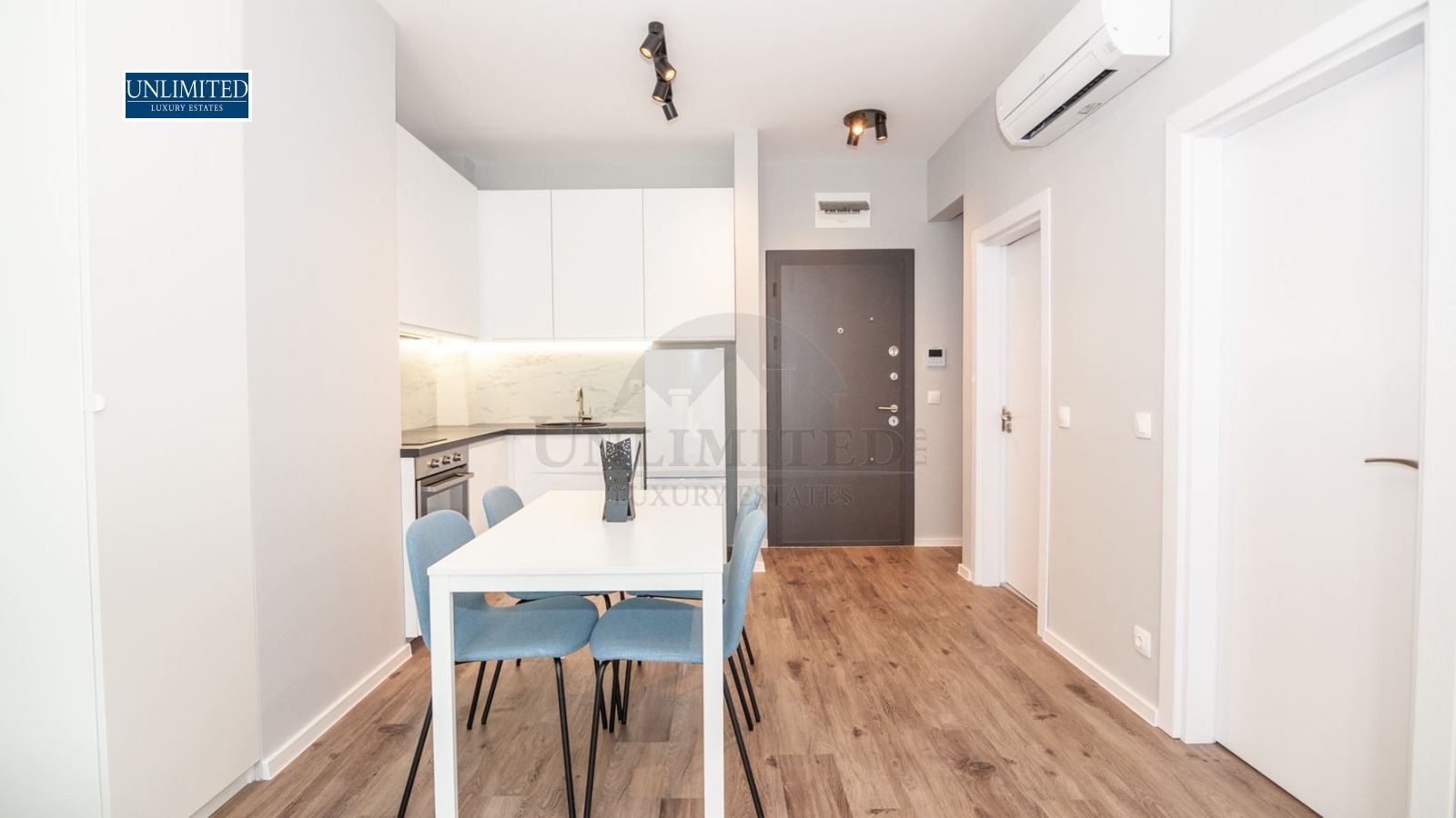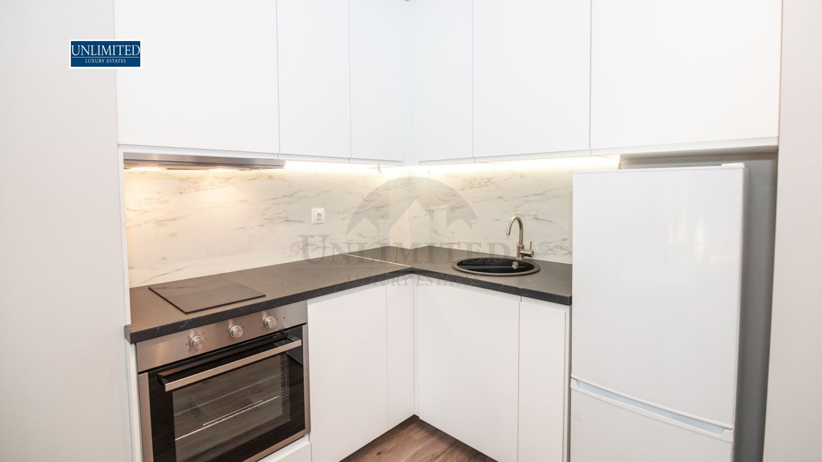 Кухненският бокс е изцяло оборудван с вградени електроуреди и стилно LED осветление, а трапезарната част е удобно интегрирана към дневната, създавайки уютна среда както за ежедневие, така и за гости.