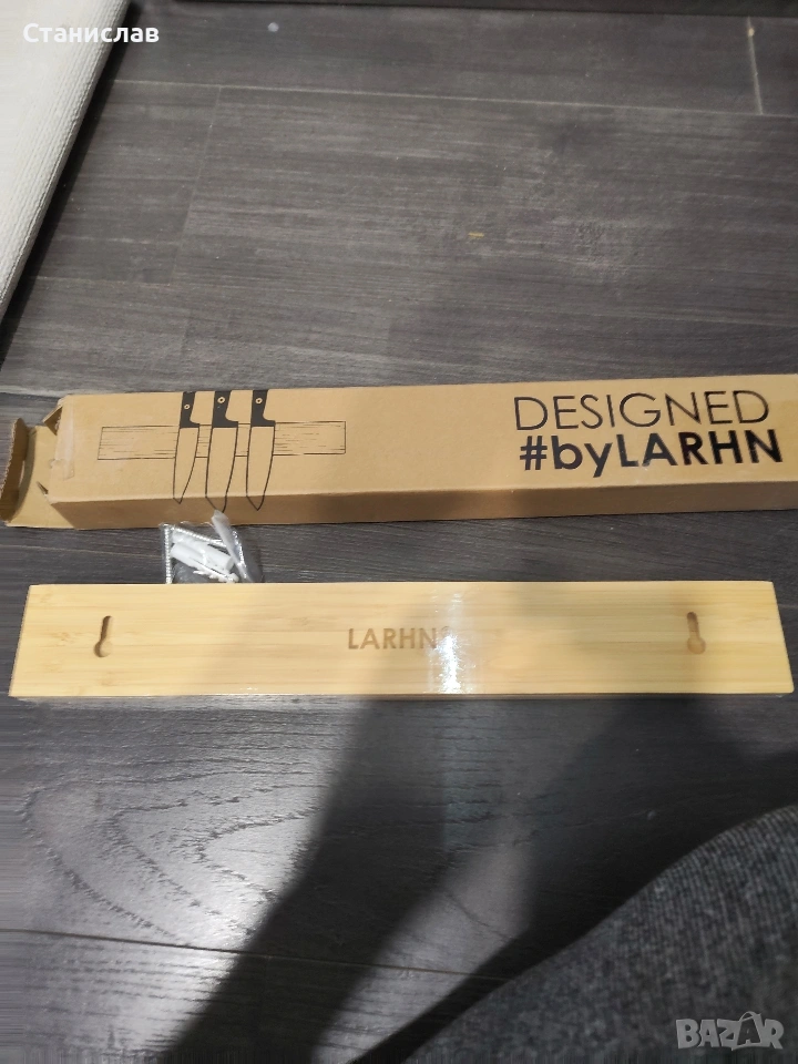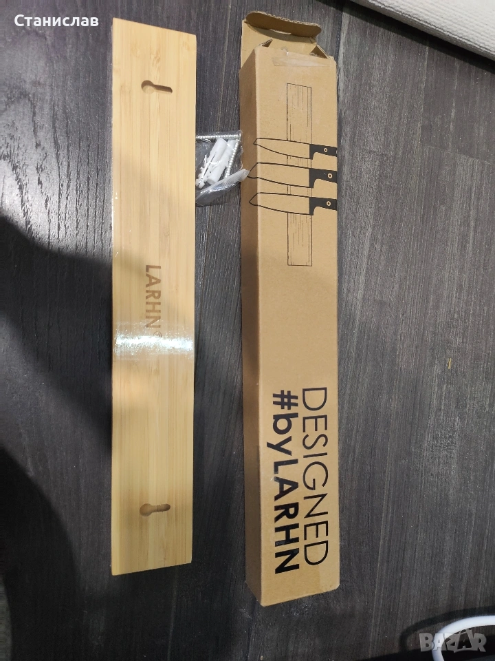 Този предмет е магнитна стойка за ножове от бамбук, предназначена за стенен монтаж. На снимката е показана задната част на стойката с отвори тип „ключова дупка“ за лесно окачване, а до нея се виждат включените в комплекта дюбели и винтове за монтаж. Детайли за продукта Марка: LARHN. Материал: Естествен бамбук, който е устойчив и антибактериален. Функция: Скрити мощни магнити позволяват закрепването на ножове и други метални кухненски инструменти директно върху дървената повърхност. Предимства: Спестява място на плота и предпазва остриетата на ножовете от затъпяване (за разлика от съхранението в чекмедже).