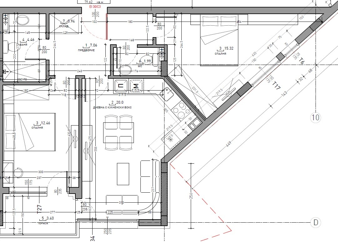 3 стаен Апартамент,изложение ИЗТОК и следното разпределение: Предверие, дневна с кухненски бокс, две спални, баня с тоалетна, второ санитарно помещение с тоалетна, склад и тераса. Обща площ: 96,34кв.м, чиста площ: 79,62кв.м.