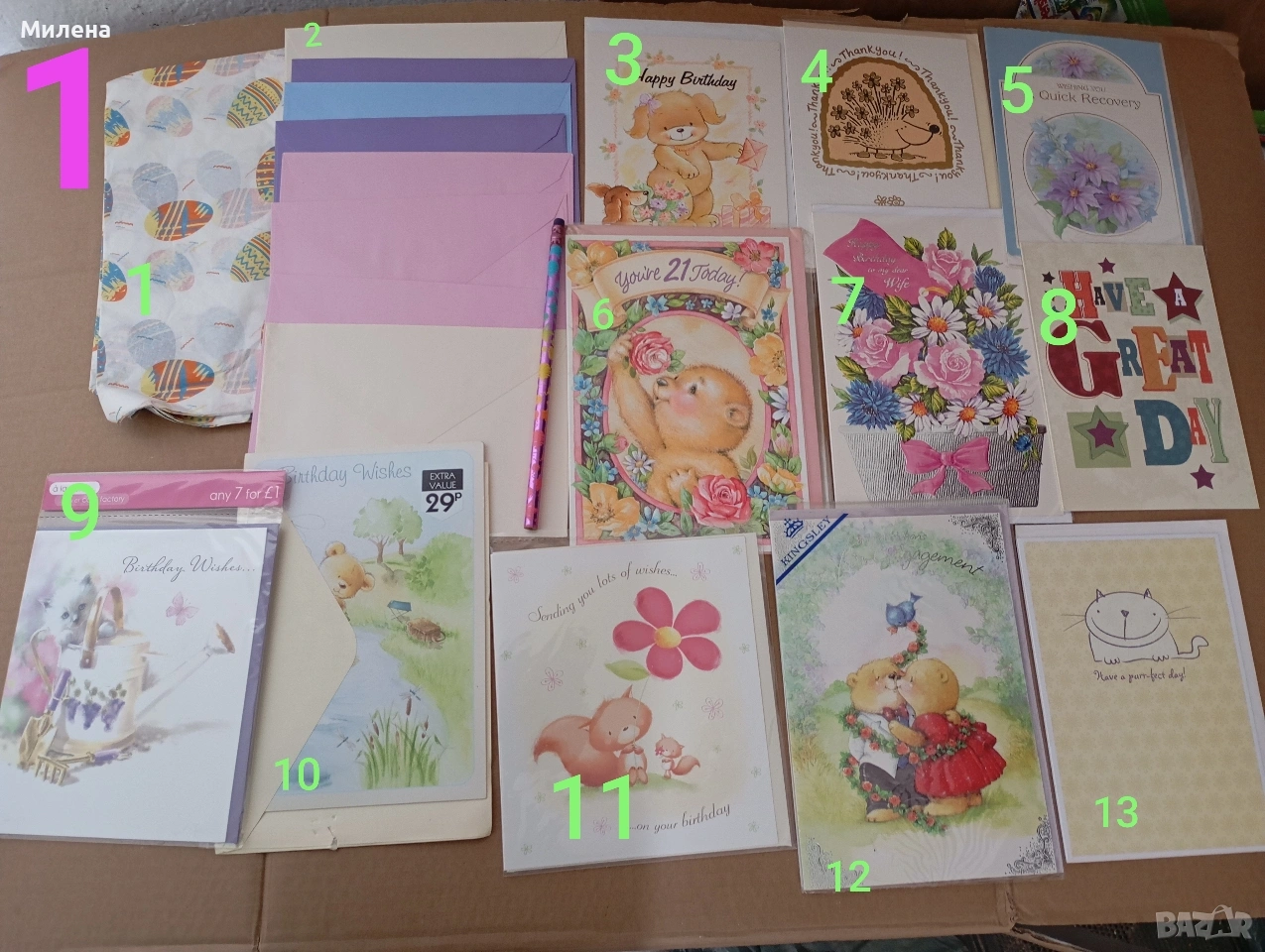Лично предаване във Варна. Продавам нови неупотребявани поздравителни картички и цветни пликове.Някои са в оригиналните си найлонови опаковки.Цена за картичка 1,50 Евро. Продавам туристически картички на цена 1,50 Евро за брой.