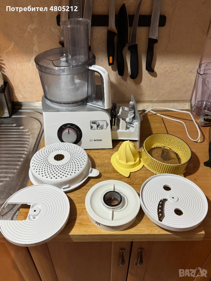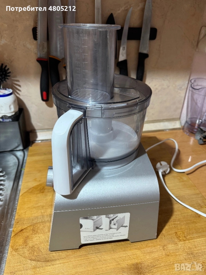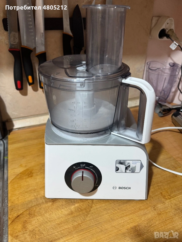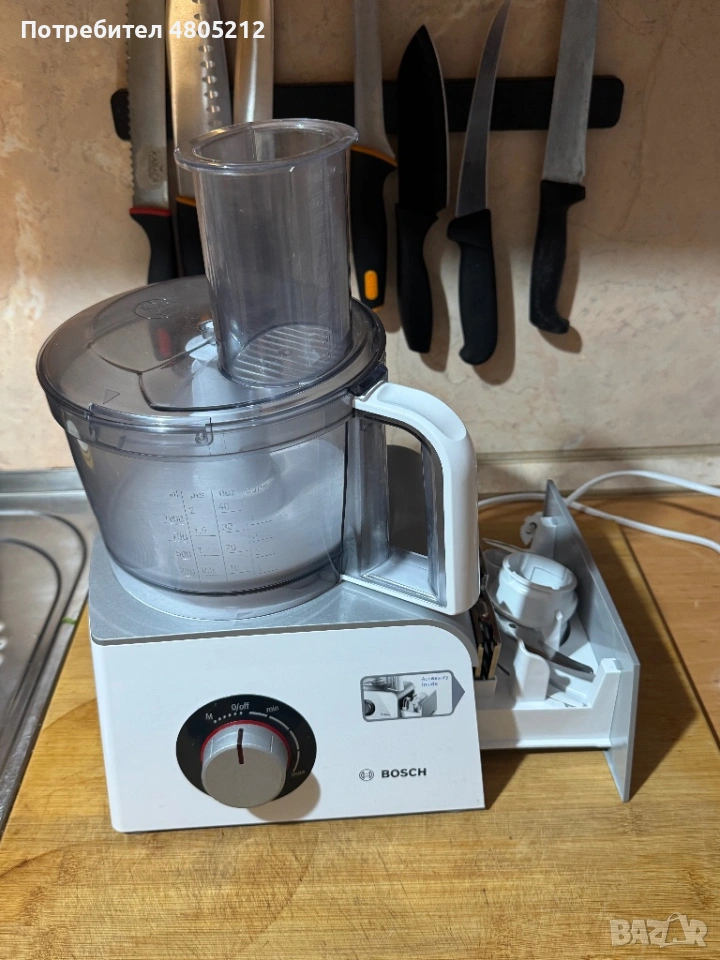 кухненски робот Bosch MCM4200 (800W) в отлично състояние . Машината е използвана трикратно и е в изключително запазено състояние което може да се удостовери от приложените снимки , мощна и практична, като разполага с интелигентно вградено чекмедже за приставките, което пести много място. Основни приставки в комплекта:
