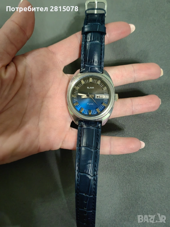 Предлагам стилен ретро часовник Slava с атрактивен биколор циферблат (синьо/черен градиент) и функция ден/дата.