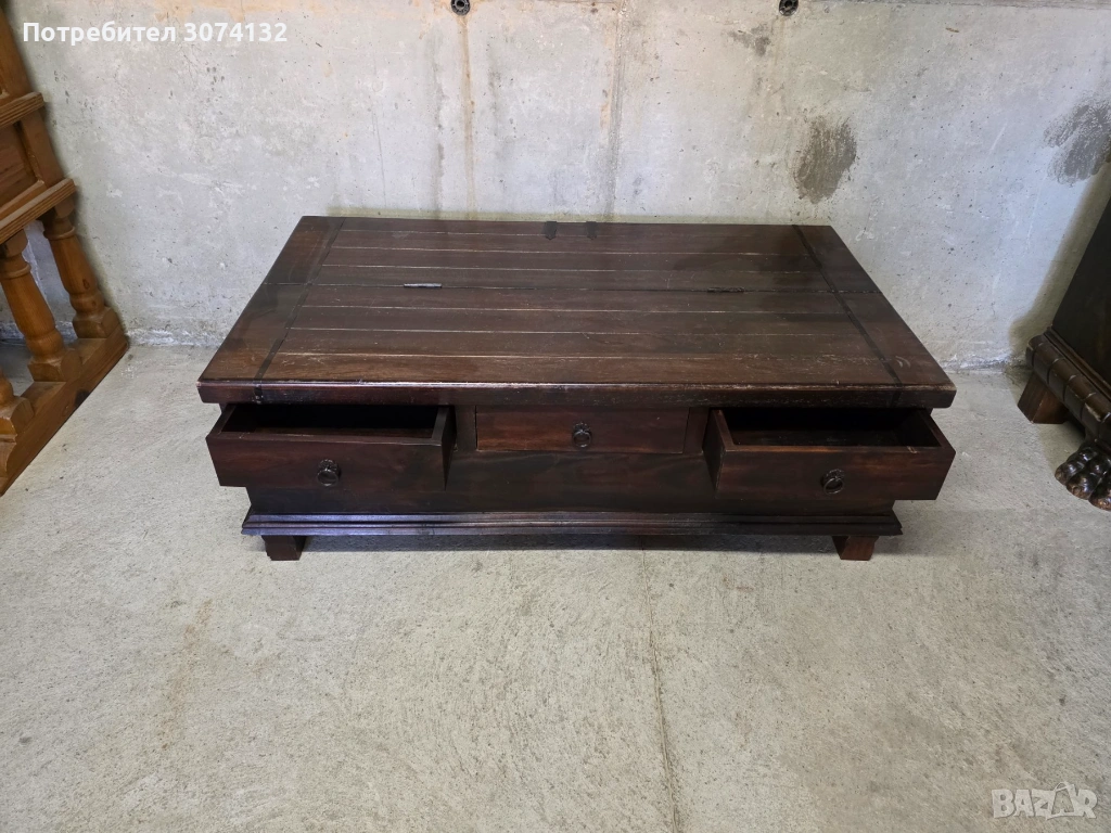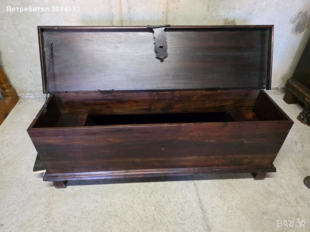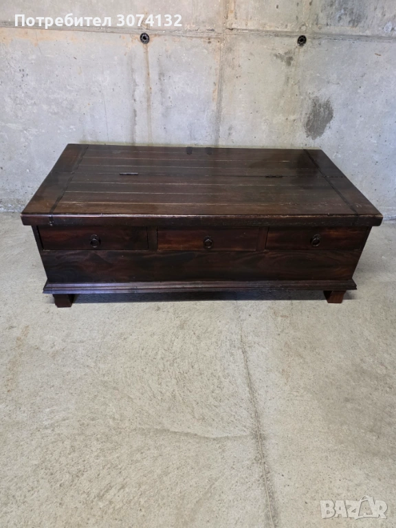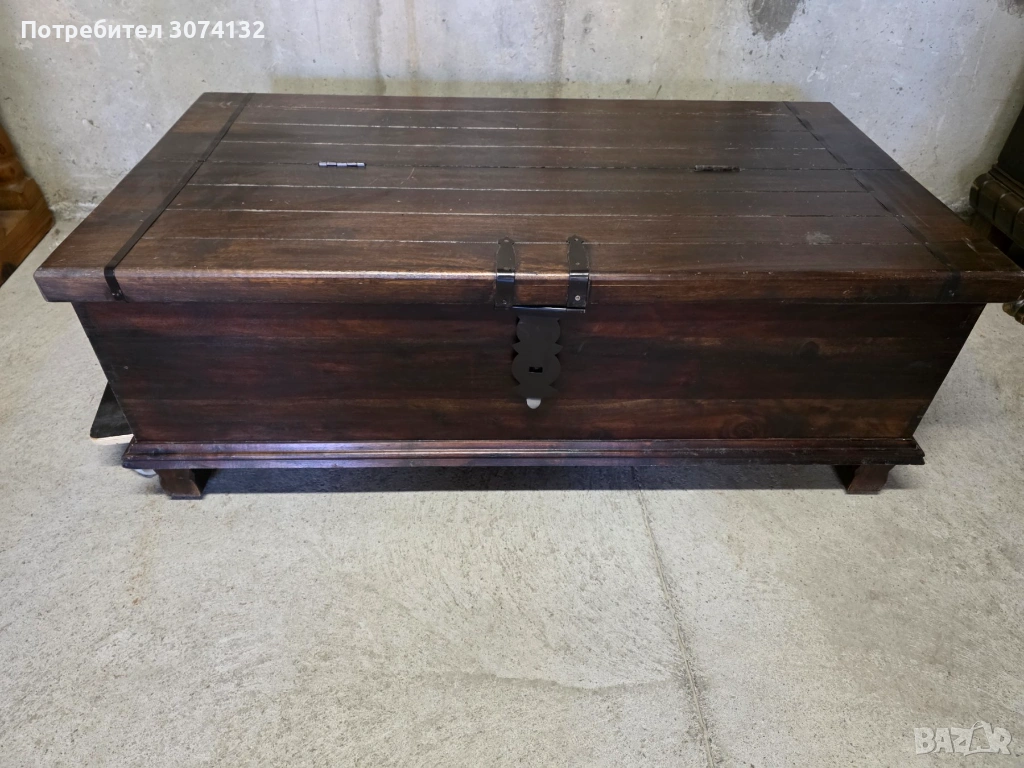 Уникална дървена масичка/сандък с характерен винтидж дизайн. Изработена от качествен дървен материал с изтъркан, патиниран вид. Подходяща за съхранение на вещи или като декоративен елемент в дома.