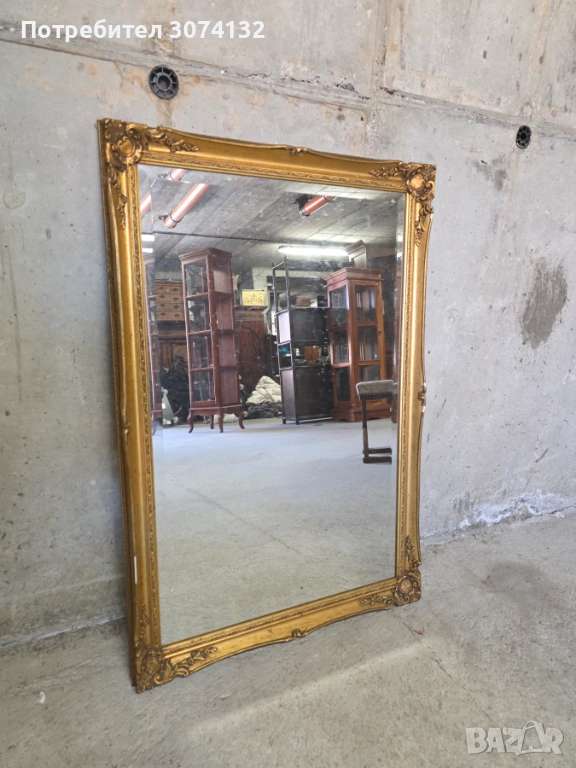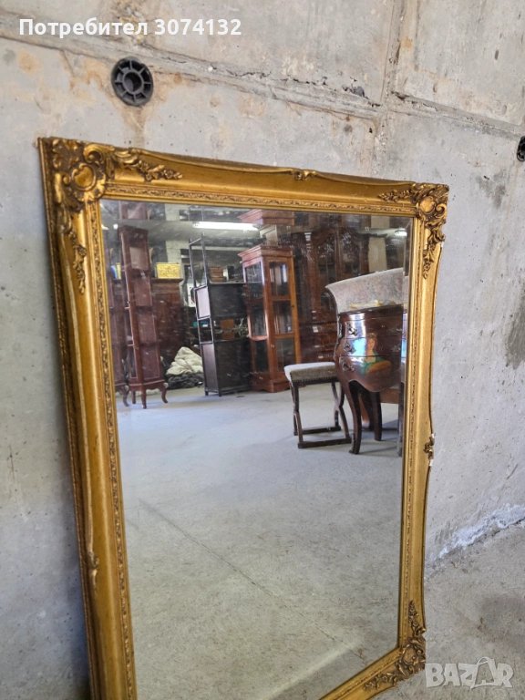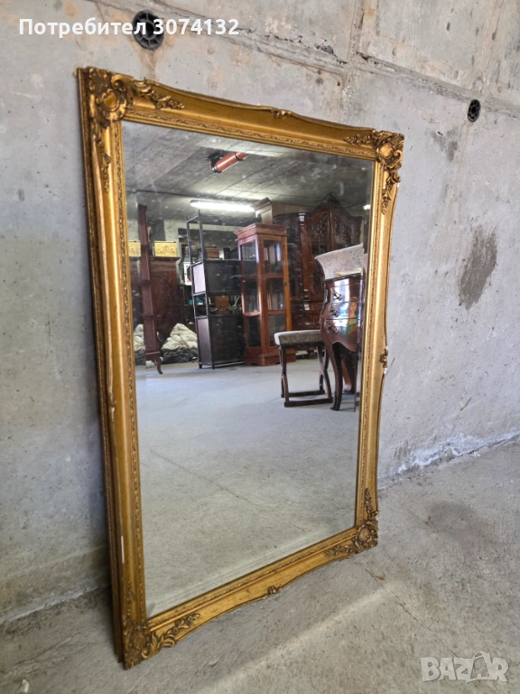 Красиво изработено огледало в златна рамка, подходящо за украса на стена в дома или офиса. Рамката е с изящни декоративни елементи, което придава на огледалото изискан и стилен вид. Размерите на огледалото са подходящи за поставяне в различни помещения.