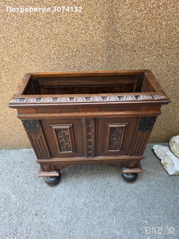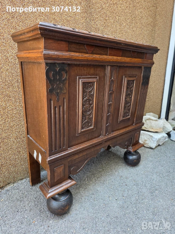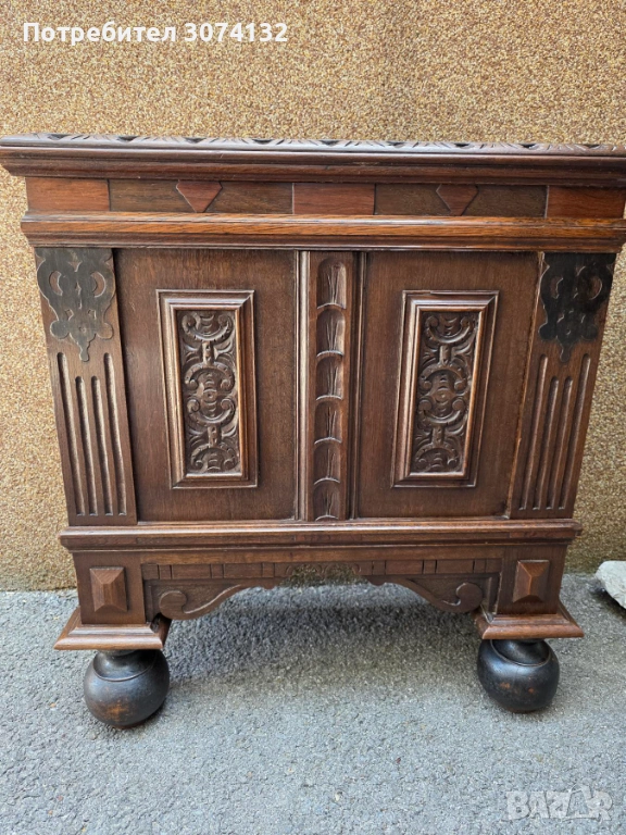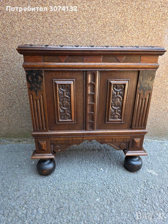 Антикварен шкаф в готически стил, изработен от дърво. Шкафът е с богато резбовани врати и декоративни елементи, които придават уникален и автентичен вид. Подходящ за декорация на интериора в традиционен или ретро стил.