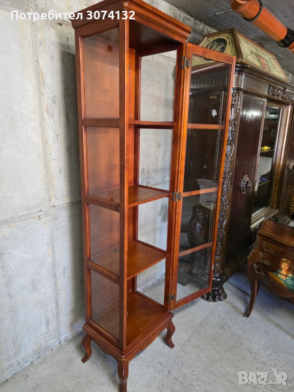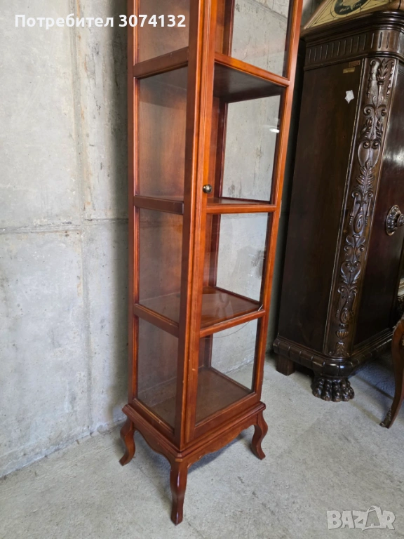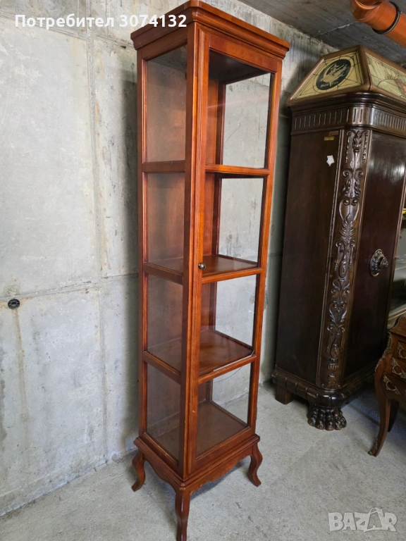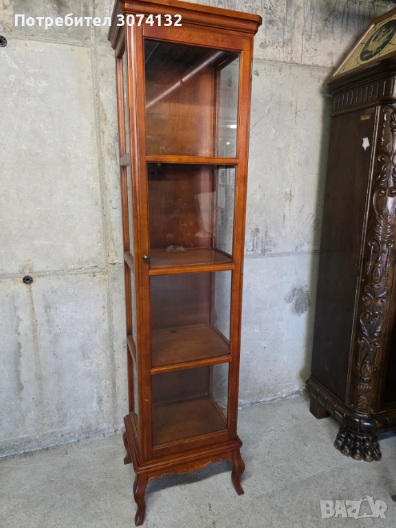 Този дървен шкаф с витрина в стил Луи е изработен от качествена дървесина и има няколко рафта за съхранение на предмети. Шкафът е с изящни орнаменти и подходящ за поставяне на декоративни елементи или малки колекции. Подходящ е за употреба в дневна, спалня или всекидневна.
