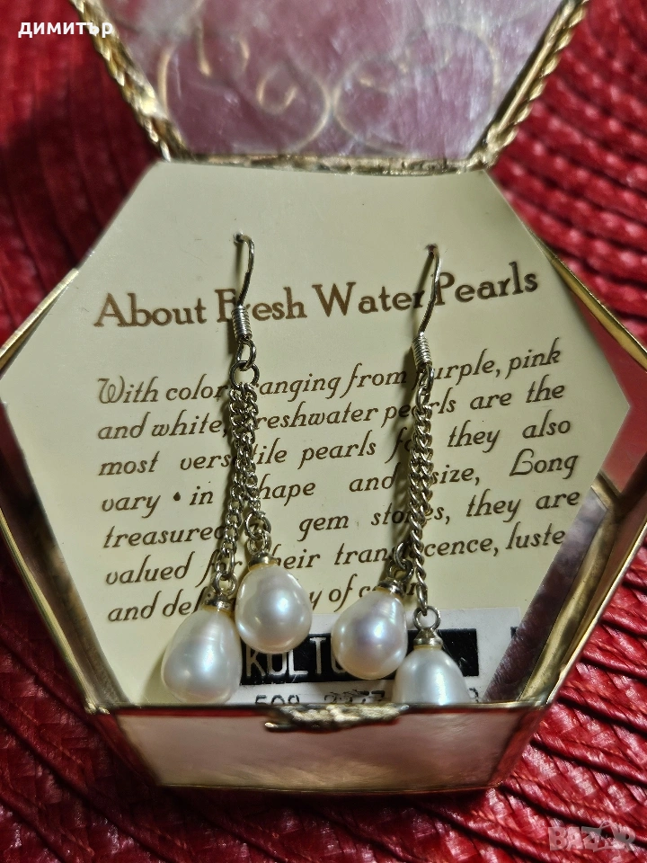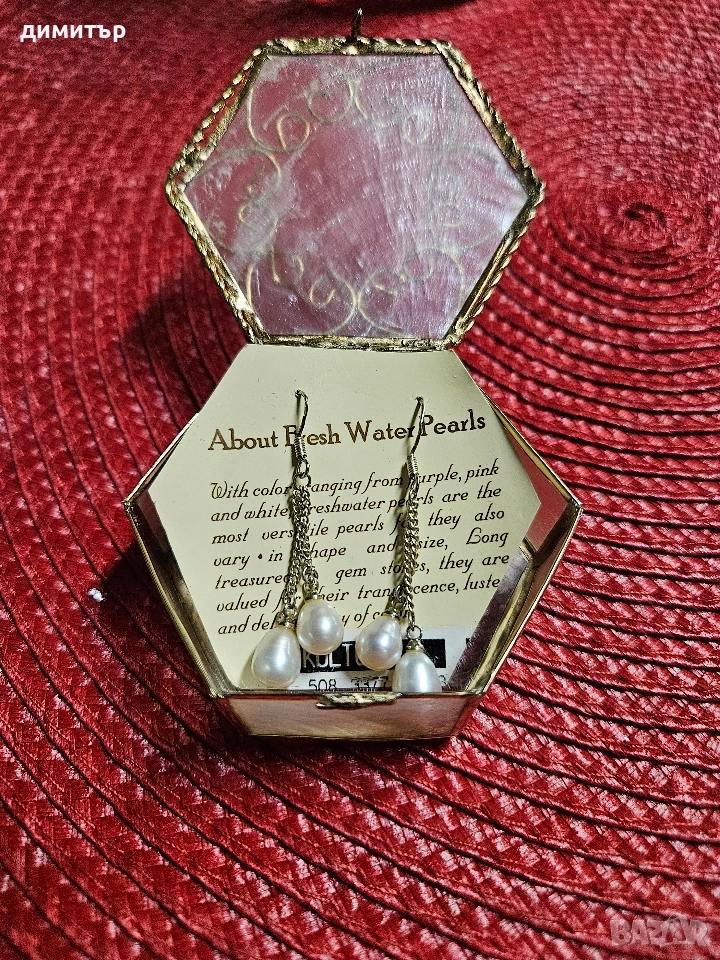 Нежни, стилни и изключително женствени обеци със сладководни перли, които придават изисканост и фин блясък на всяка визия. Подходящи както за специален повод, така и за красив подарък. Предлагат се с уникална подаръчна кутия от стъклопласт, която ги прави още по-впечатляващи.