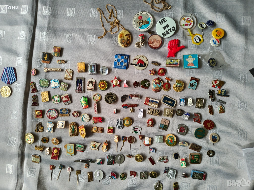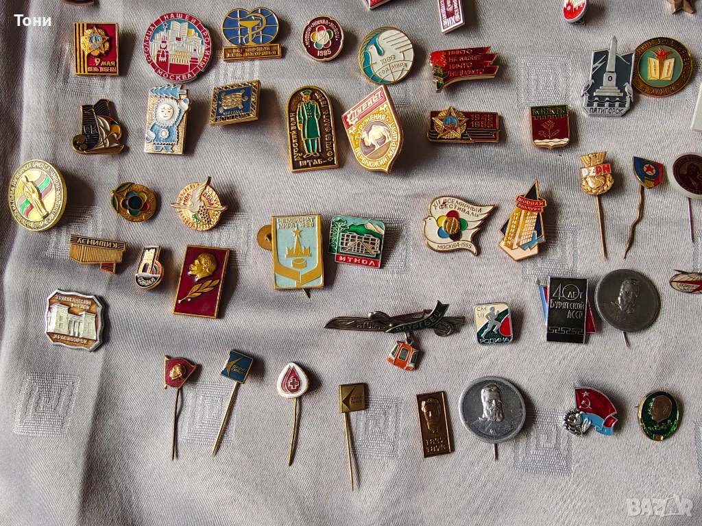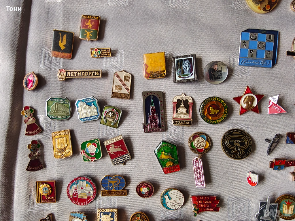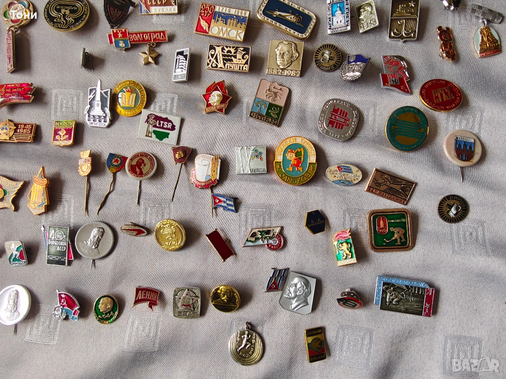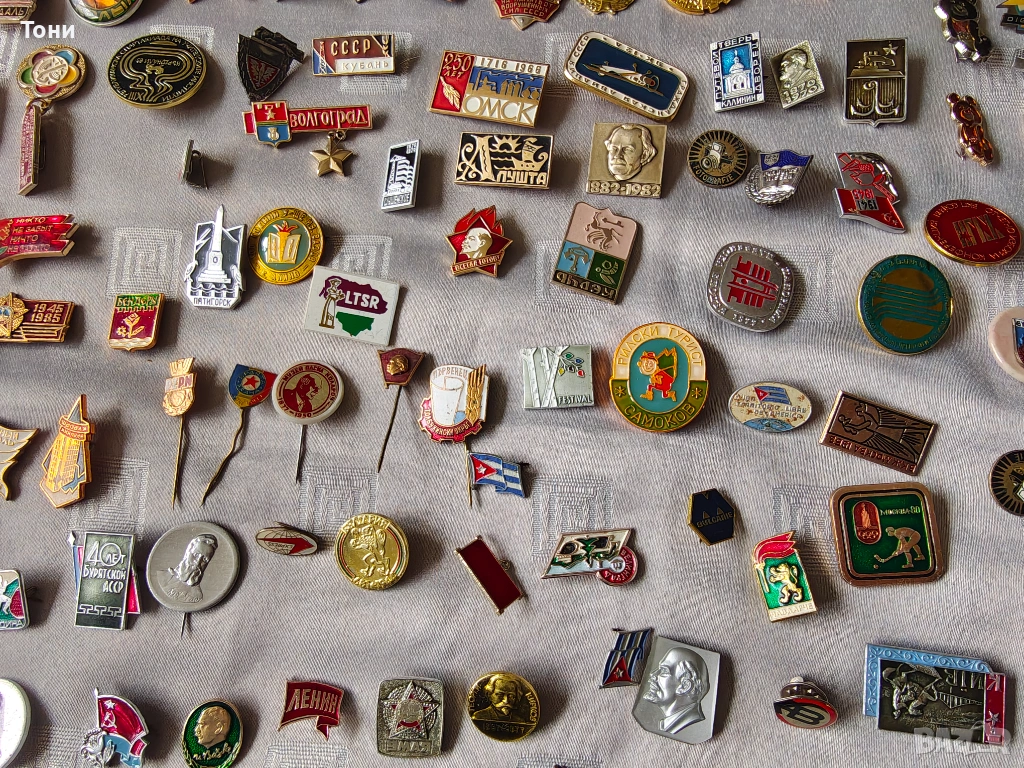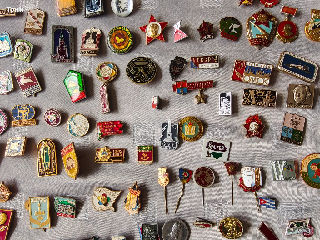 - Лениниана: Множество значки с лика на Владимир Ленин – от малки златни профили до червени знамена на Комсомола (ВЛКСМ).