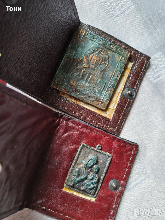 - Исус Христос Пантократор и Богородица с Младенеца: Две метални пластини (мед/бронз) с патина, закрепени в кожени калъфчета. Предназначени за закрила по време на път.