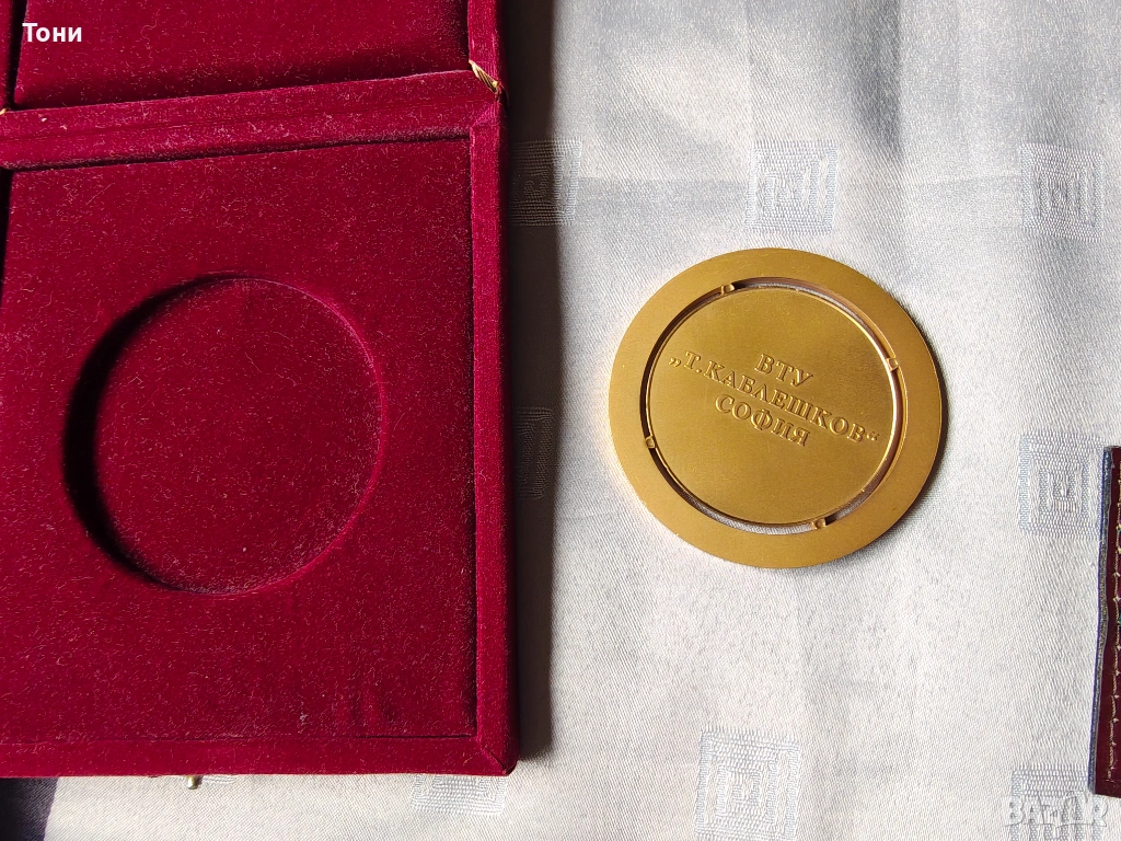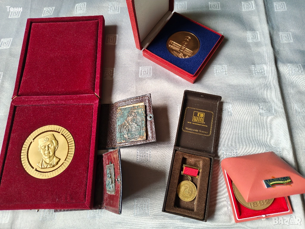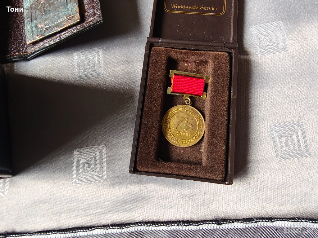 - Юбилеен медал „75 години“: Поставен в кафява кутия „WIN International“, вероятно свързан с трудов юбилей или международна организация.