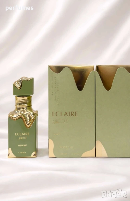 Eclaire Pistache от Lattafa Perfumes е ориенталски ванилов аромат за жени и мъже. Това е нов аромат. Eclaire Pistache е пуснат на пазара през 2025 г. Ароматизатор на този аромат е Далия Изем. Връхни нотки са крем от шамфъстък и шамфъстък; средни нотки са бита сметана, какао и кокос; базови нотки са ванилия, мляко и мускус.