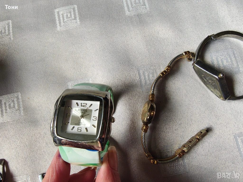 - Diesel Time (Зеленият): Артистичен модел с широка твърда гривна (тип белезник) и абстрактен зелен принт. Масивен корпус от стомана, много модерен и смел дизайн. 50 евро