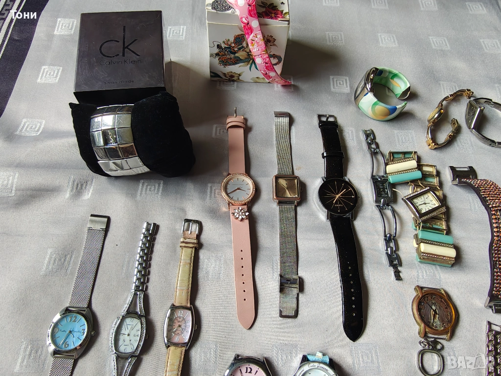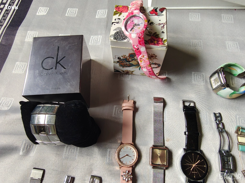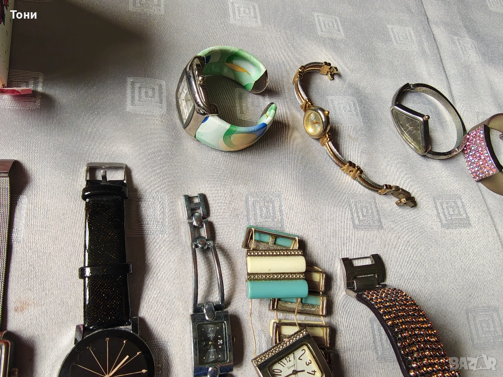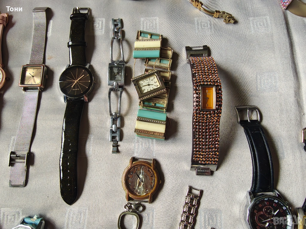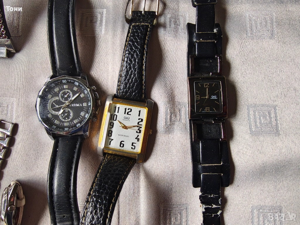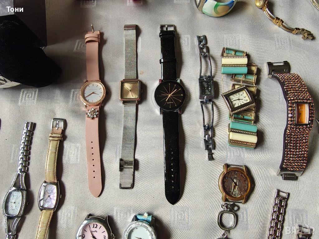 - Prеma (големият черен часовник): Мъжки модел с голям черен циферблат и кожена каишка, който контрастира на останалите по-фини дамски модели.
