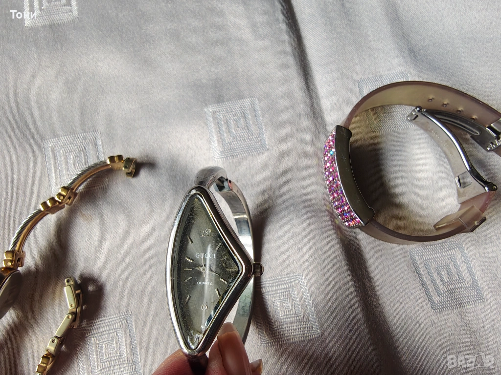 - Gucci (Триъгълният): Уникален винтидж модел с триъгълен циферблат и твърда сребриста гривна. Изключително разпознаваем дизайнерски аксесоар.