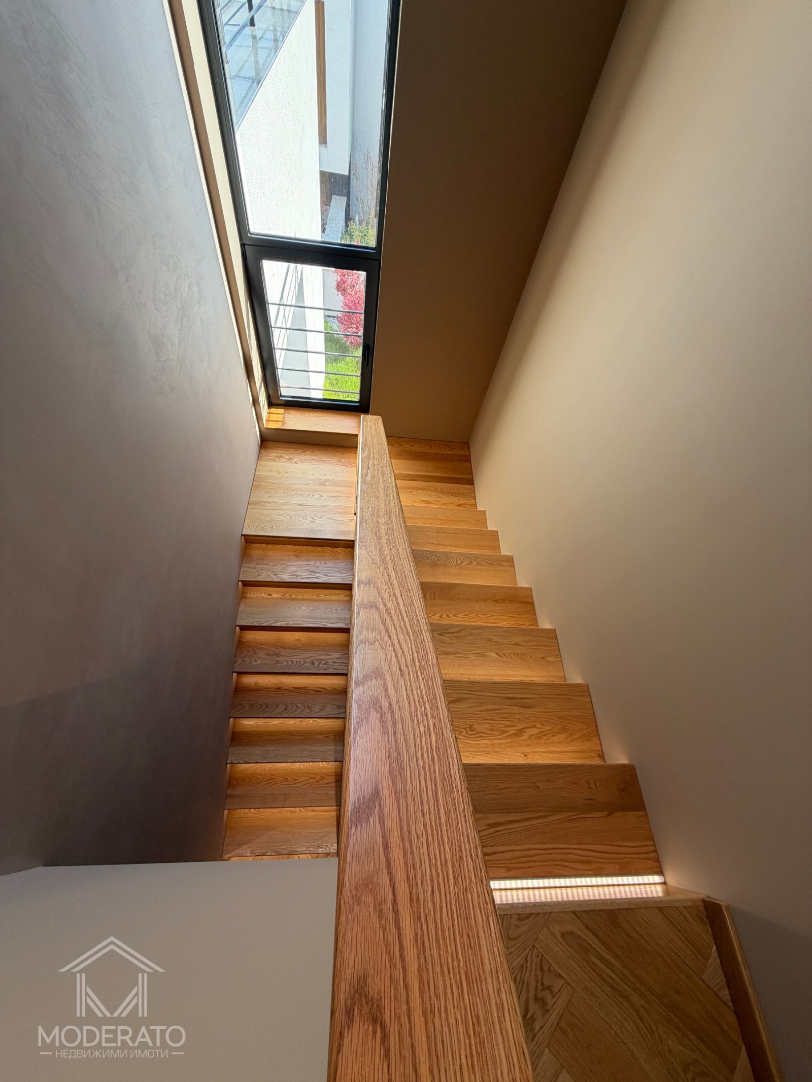 Първи етаж: антре, просторна дневна 60 кв.м. с веранда и озеленен двор с кухня и трапезария, санитарен възел, складово помещения зад стълбище
