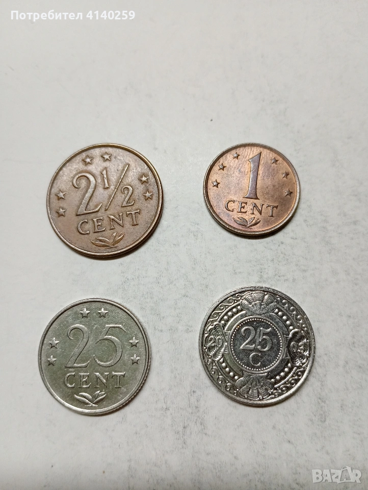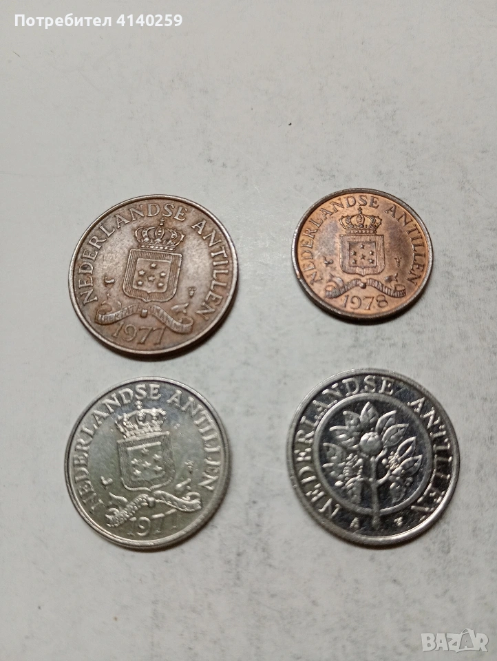 НИДЕРЛАНДСКИ АНТИЛИ МОНЕТИ ЛОТ РАЗЛИЧНИ ГОДИНИ НОМИНАЛИ ЦЕНА ЗА 4 БРОЯ СЪСТОЯНИЕ ВИДИМО ПОЛУЧАВАТЕ СНИМАНИТЕ МОНЕТИ РАЗГЛЕДАЙТЕ ДРУГИТЕ МИ ОБЯВИ ДА КОМБИНИРАТЕ ДОСТАВКА ЕКОНТ ЗА ВАРНА ЛИЧНО