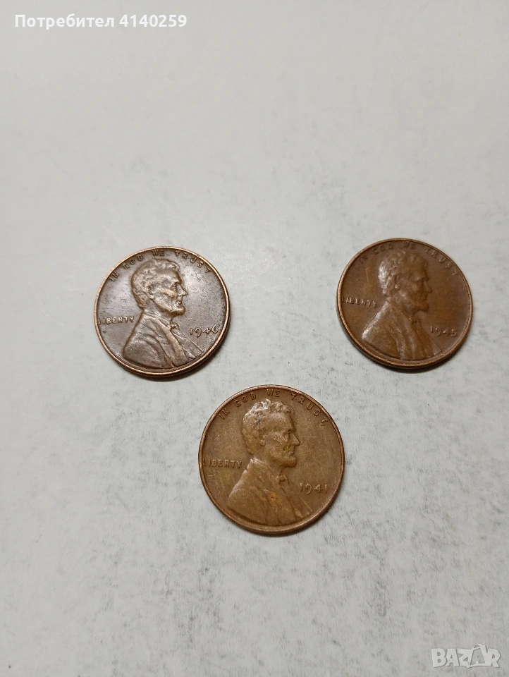 САЩ МОНЕТИ 1 ЦЕНТ 1941-1945-1946 Г ЦЕНА ЗА 3 БРОЯ СЪСТОЯНИЕ ВИДИМО ПОЛУЧАВАТЕ СНИМАНИТЕ МОНЕТИ РАЗГЛЕДАЙТЕ ДРУГИТЕ МИ ОБЯВИ ДА КОМБИНИРАТЕ ДОСТАВКА ЕКОНТ ЗА ВАРНА ЛИЧНО