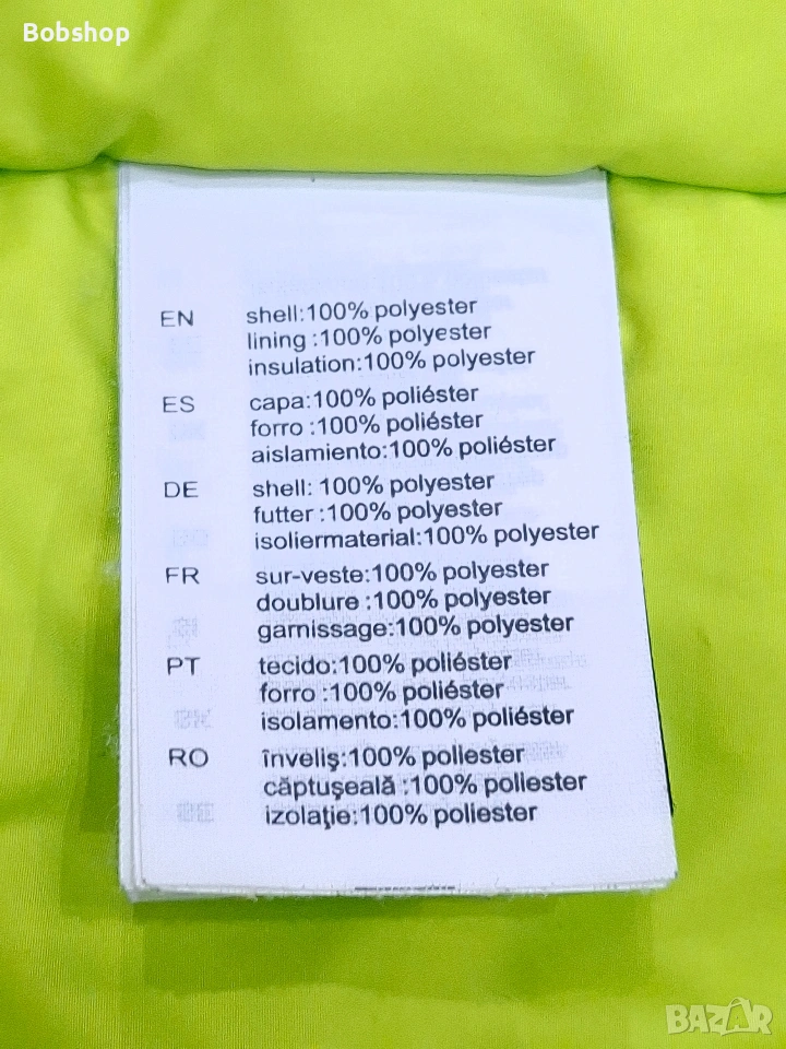 Отлично състояние, оригинален продукт, размер по етикет M, материя външна част 100% полиестер, подплата 100% полиестер, изолация 100% полиестер, два основни джоба на лицевата част, щампирано лого на лицевата част, ципове укк, произведено в Китай.