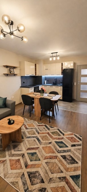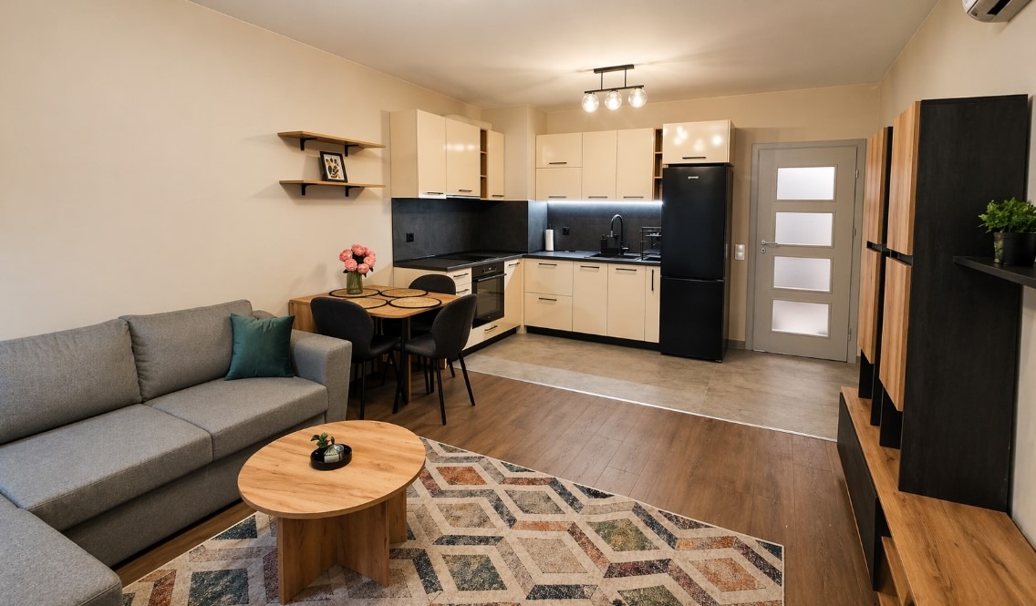Имотът е обзаведен, с площ 60 кв.м, на 5-ти от 6 етажа в сграда с асансьор. Разпределението включва входно антре, хол с кухня и трапезария, спалня, баня с тоалетна, мокро помещение и тераса.