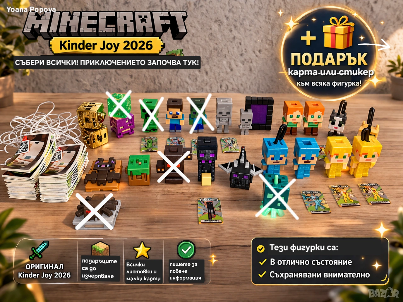Продавам фигурки от най-новата колекция на Minecraft от Kinder Joy. !Цени и Налични в обявата: Шалкер - 1,85€ !Слайм - 1,85€ ---> НЕ НАЛИЧНА! !Creeper – 1,85€---> НЕ НАЛИЧНА! Steve – 1,85€ !Zombie – 1,85€---> НЕ НАЛИЧНА! Skeleton – 1,85€ Skeleton с портал - 1,85€ Enderman – 1,85€ !Spider – 1,85€ ---> НЕ НАЛИЧНА! Alex (оранжева) – 1,85€ Златна Alex със кламер – 2,00€ Златна Alex без кламер – 2,00€ Diamond Steve със кламер – 2,00€ Diamond Steve без кламер – 2,00€ !Magma Cube – 2,50€---> НЕ НАЛИЧНА! !Октопод - 1,85€---> НЕ НАЛИЧНА Златно кубче – 5,00€ ПОДАРЪК: подарявам 1 случайна карта за всяка фигурка а при повече фигурки от 2 може да има и стикер. При поискване на конкретна карта/и се плаща, пишете ми за повече информация. Изпращам по Спиди. За София е възможно и лично предаване, но САМО на спирка Плиска!