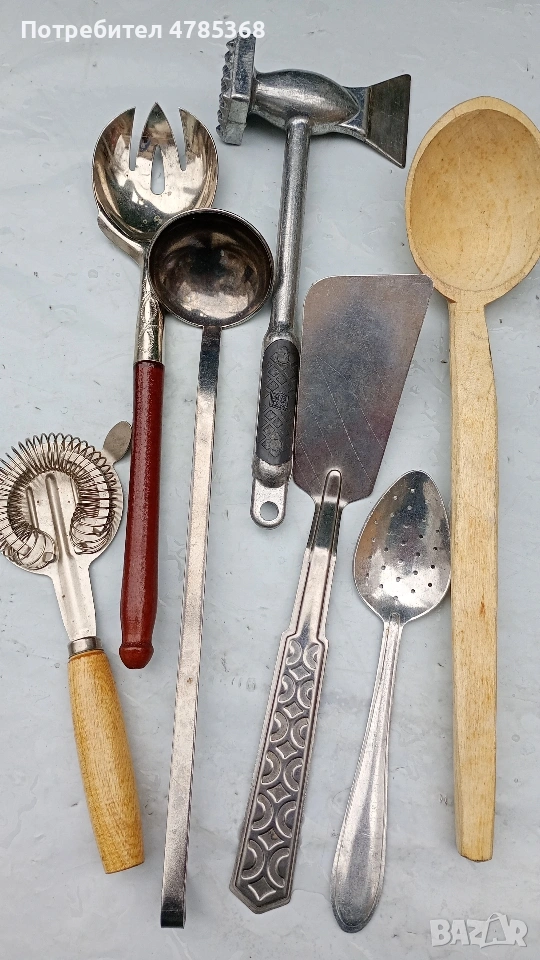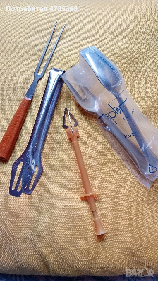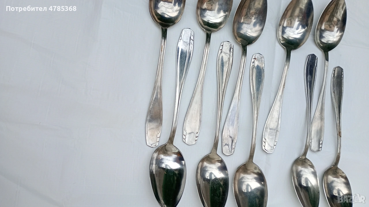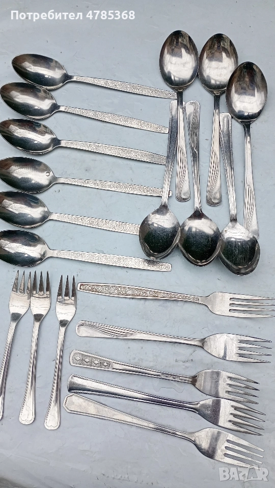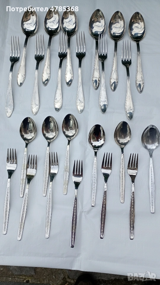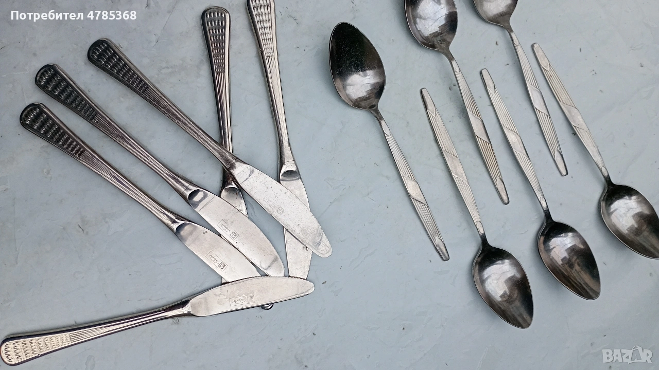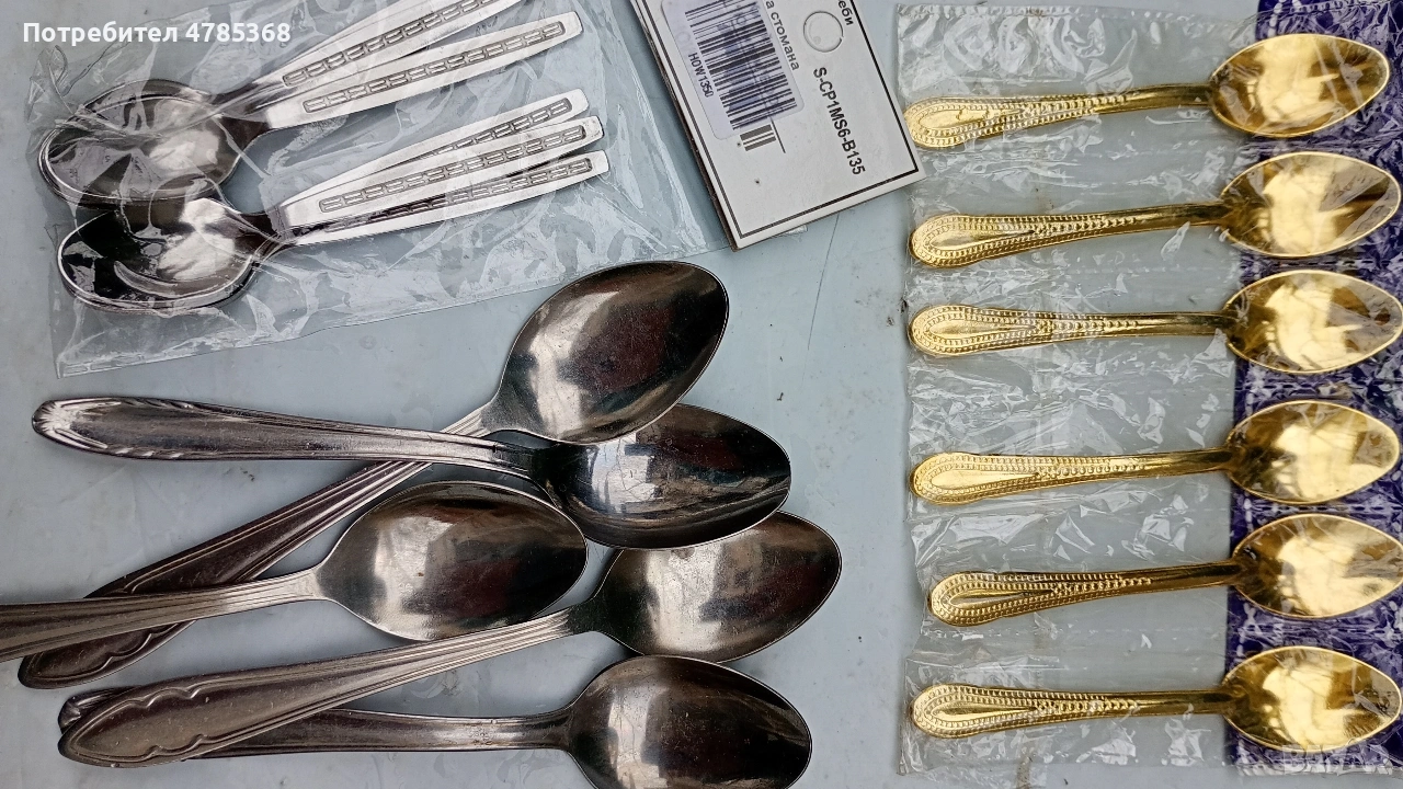 Нови два комплекта основни лъжици и вилици по 6 броя, общо 12 броя за един комплект, цена 10 € за комплект + 10 броя неупотребявани големи супени лъжици от преди 70-80 години, цена 10 € за всички + Порционни/основни ножове за основно ястие с трионче, 8 броя, цена 8 €, може да се комбинират с лъжици и вилици от началото на обявата, първа снимка + Малки чаени лъжички с изображение на цяла роза върху ръкохватката, 12 броя, цена 10 €+ Нови малки кафени лъжички, 6 броя в опаковка, цвят жълт, цена 3 € + Нови 2 комплекта чаени лъжички по 3 € за комплект + 6 броя супени лъжици, цена 4 € + 6 броя порционни/основни ножа, вид "Перла" с отлични триончета, цена 5 € + 2 комплекта по 6 броя супени лъжици, в ляво цена 5 €, вдясно цена 3 € + 3 броя малки нови десертни вилички, цена 2 € + 5 броя порционни/основни вилици, различна шарка, цена 3 € + 7 броя кухненски прибори с обща цена 16 € + Щипки кухненски и за сервиране на маса, за храна-самовръщаща се, за лед и голяма вилица обща цена 16 € + На същата снимка голяма щипка лъжица-вилица марка "